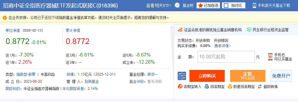 $招商中证全指医疗器械ETF发起式联接C(OTCFUND|018396)$