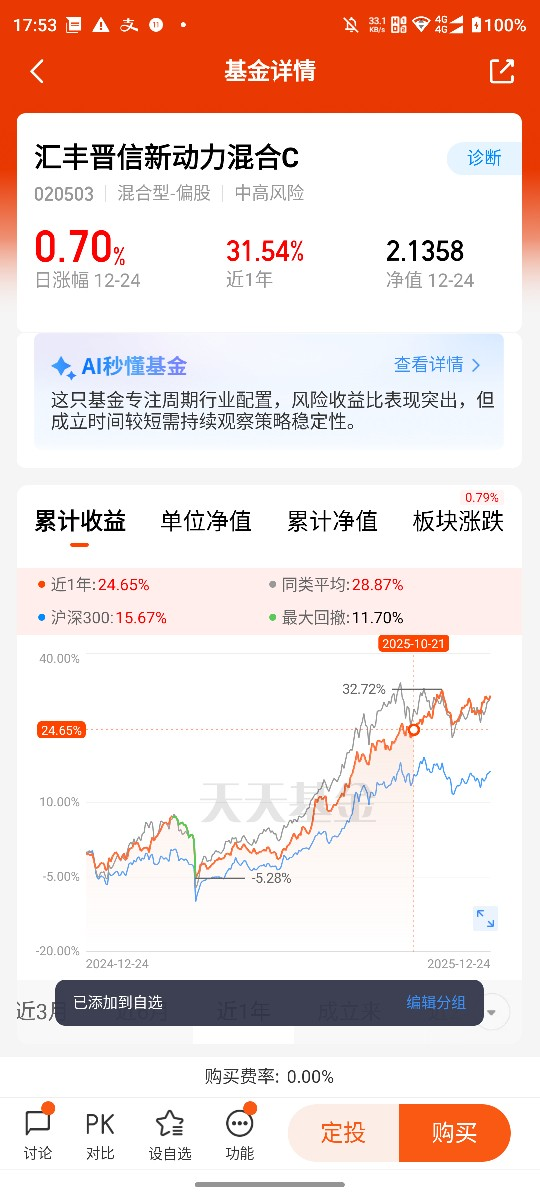 关注超额收益,本质是规避“伪收益”陷阱,锁定可持续的投资价值。Wind数据显示,近三年主动权益基金业绩分化巨大,近四成产品跑输基准超10个百分点,而超额收益首尾相差竟超过300个百分点。很多投资者曾陷入“短期收益迷思”:某只基金单季度收益亮眼,看似表现优异,实则可能只是重仓了阶段性热门行业的“Beta红利”,一旦风格切换,收益便快速回落。而真正的超额收益,需要通过跨周期验证——在牛市、熊市、震荡市等不同市场环境中均能稳定跑赢基准,这种穿越牛熊的能力,才是基金经理投资体系成熟、策略可复制的体现。汇丰晋信新动力混合C之所以能跻身[追求超额圈]热门产品,核心便在于其背后的投研团队能够持续挖掘可持续Alpha,而非依赖短期风格红利。