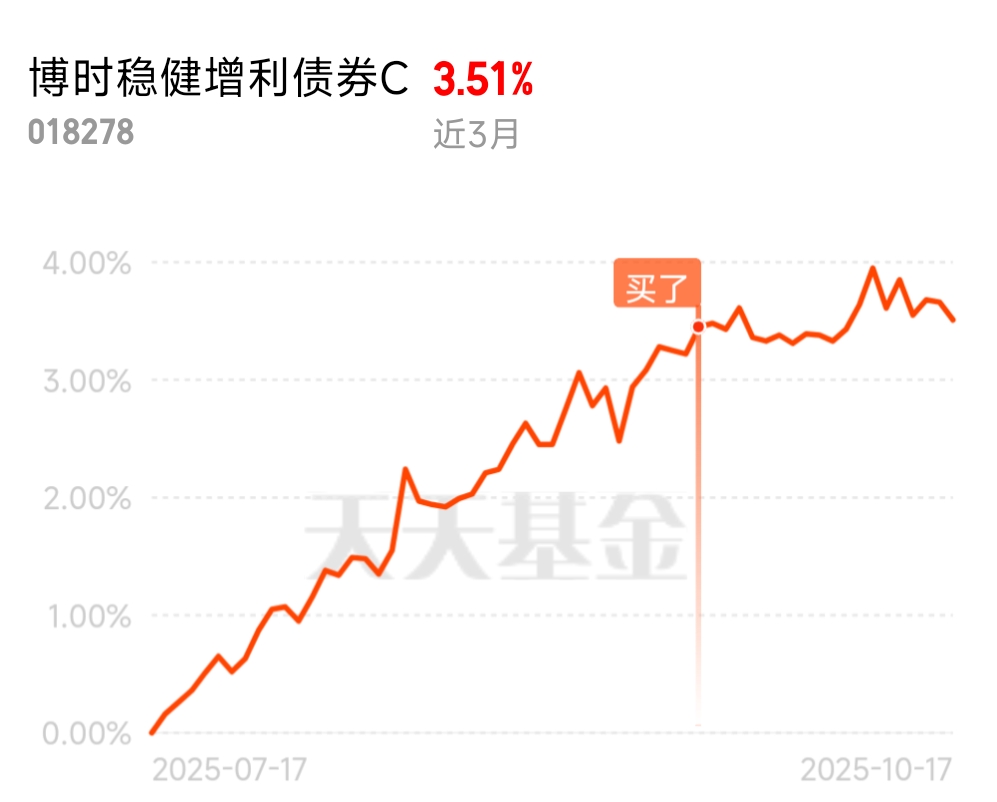不得不说固收+策略在当前市场,收益优势明显,就拿$博时稳健增利债券C$ 来说,它的业绩就十分漂亮,三个月涨幅稳超3.5%,半年累计收蛋674个。这只基金的债券操作非常灵活,经理会根据市场调整久期,之前债市调整时果断降久期控风险,现在政策宽松预期起来了,又提前布局中长期债,它的收益一路平稳增长。最近货币政策宽松信号越来越明确,央行连续开展大额逆回购,资金面一直偏松,DR007这些关键利率持续回落。政策发力的迹象很明显,市场在等后续降准降息,一旦降息落地,基金持有的中长期债券就能获得可观的资本利得,这部分收益值得期待。更绝的是它的权益仓,基金经理提前布局了AI应用和机器人板块的龙头股,不是那种炒概念的小票,都是有实际业绩支撑的企业。这段时间科技股反弹,正好给收益加了buff,别人的债基还在赚票息,这只已经靠权益仓多赚了不少。最近净值小幅回调,我又加了一笔,“低成本+政策利好+精准选股”三大优势叠加,四季度大概率能再创新高。#亚太股市杀跌 市场开启避险模式?#