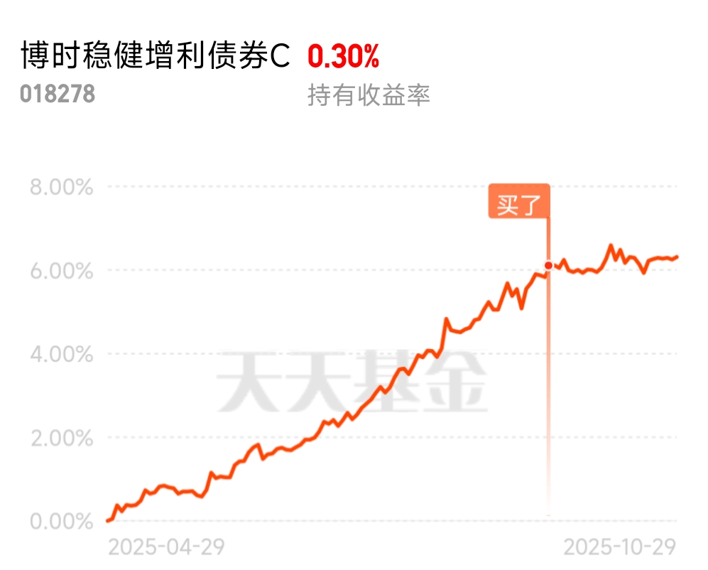 近期债市慢慢回暖,$博时稳健增利债券C$ 昨天又添了6个蛋,近三个月累积收益2.79%,半年收益率稳稳站在了6%以上,表现十分亮眼。在上季度债市调整时,很多基金都大幅回调,但这只基金不仅回撤控制得特别好,收益还一路稳涨,这得归功于它的债券调仓灵活,外加权益仓选得精准。近期央行释放的利好简直是给这只基金“添柴加薪”。10月27日潘功胜行长在金融街论坛上说要恢复公开市场国债买卖操作,当天盘后10年、30年国债活跃券收益率直接下调,多头情绪一下就起来了。其刚好重仓了5年左右的国债品种,正是央行可能重点增持的领域,这波行情算是精准踩中了。它的权益仓也很有讲究,虽然合计不超过20%,但主要投的是高景气行业的ETF和龙头股,最近科技板块回暖,刚好贡献了额外收益。且基金经理操作风格特别稳,不会盲目追涨杀跌,还投了一些可转债,既能享受债市收益,又能蹭股市红利,这种灵活配置适应能力极强,面对现在这种复杂的经济环境和政策变化,这基在控制回撤的同时还能适时捕捉机会,表现一直很稳。#科技热点摊开业啦#