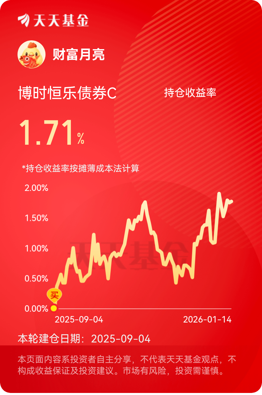 债市稳健,股市活跃,固收+产品备受青睐。$博时恒乐债券C$ 侧重债券、辅以股票的配置,能有效平衡风险与收益。昨日收获3个蛋,近六个月涨幅稳超4.3%,业绩非常出色。今年债市的一个重要特点就是“短端韧性强、长端承压”,祺顺观察的2026年债市展望报告也提到,1-3年短久期产品能有效规避长端利率波动风险,是当前的配置主流。这基恰好聚焦这类短久期资产,完美契合了今年的市场环境。再加上今年银行和保险的配债需求预计比去年一季度好很多,尤其是银行受益于存款利率未行政性调降,保险有分红险支撑,这会给短久期利率债带来稳定的需求支撑,进一步提升产品的安全性。而且这基的权益仓还藏着有色金属板块的惊喜,新进了宏创控股,1月以来有色金属板块整体回暖,作为铝加工行业的优质企业,受益于新能源汽车和光伏行业对铝制品需求的提升,长期成长逻辑很清晰。而且最近大宗商品市场迎来利好,全球经济复苏预期增强,工业金属需求有望持续回暖,这对宏创控股来说是实打实的利好。这基既能靠短久期债券稳住收益基本盘,又能靠优质权益标的赚点额外收益,妥妥资产配置好选择。#AI应用元年开启!概念股持续走强# #晒收益#