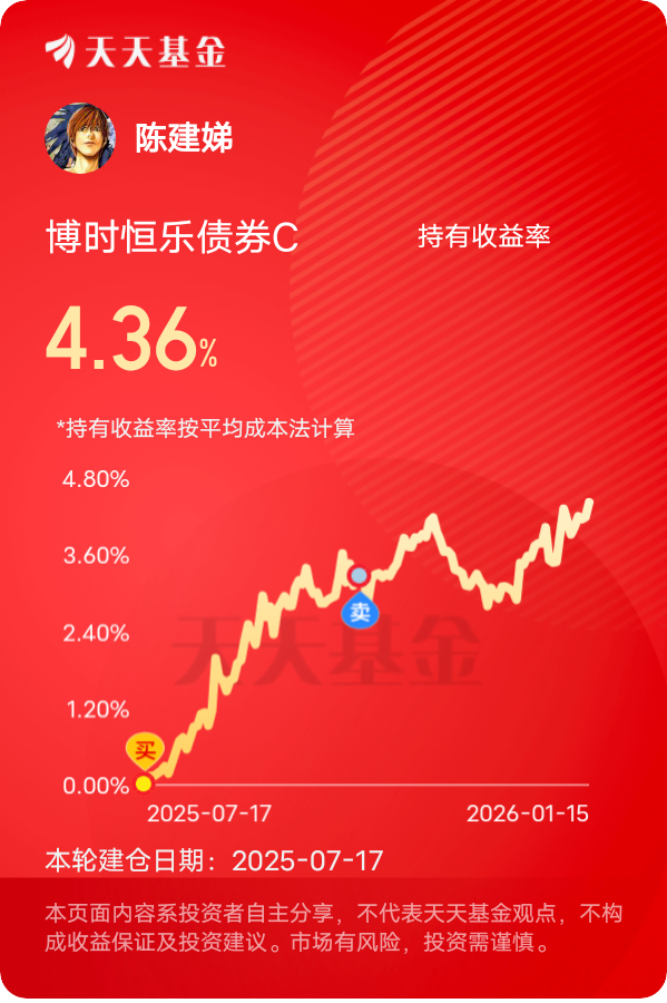 最近债市行情向好,$博时恒乐债券C$ 债券为主,股票为辅,昨天权益仓行情抓得好,这基两头受益,稳稳拿下23个鸵鸟蛋。近一个攒了135个蛋,六个月时间到账438个,这持续赚钱能力很强。最近央行宣布再贷款、再贴现利率下调!1月15日央行明确自1月19日起,下调再贷款、再贴现利率0.25个百分点,下调后1年期支农支小再贷款利率降到1.25%,再贴现利率1.5%。这个政策直接降低了银行的资金成本,稳定净息差的同时,也给债市流动性环境添了把火。这基的债券仓位以高等级信用债和利率债为主,还会通过息差策略放大收益,资金成本下降后,债券市场的整体收益空间被打开,这基自然能精准受益。而且它权益仓位的热点踩中率,简直像开了上帝视角!配置了消费电子板块个股,近期消费电子迎来换机潮叠加技术升级,相关个股走势强劲,直接给基金收益加了buff。另外还布局了港股通里的优质标的,利用两地市场估值差异套利,最近港股市场情绪回暖,这部分仓位也贡献了不少收益。这基权益策略是沪港深三地精选个股,再搭配ETF布局,既分散了风险,又能精准捕捉不同市场的热点,灵活又稳盈!#存储芯片需求火爆 巨头新产能提前投产# #晒收益#