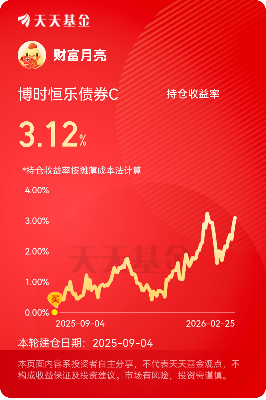 昨天债市下了点小雨,但$博时恒乐债券C$ 的权益仓却踩准了热点,日赚27大蛋。近一年累计蛋数已达930多。这基债为底、股增强的策略确实靠谱,短期爆发力强,长期耐力足,体验感爆棚。2月25日央行6000亿MLF加量续作,净投放3000亿,相当于直接给债市灌“活水”。而且这次是连续12个月加量续作,政策面偏松的信号特别明确,加上节后资金面本来就宽松,R007一直稳在1.5%-1.6%的区间,债市的大环境友好,债券需求涨了,价格自然就往上走,债基收益自然就稳了。而且它的权益仓位,布局很精准,完全踩中了当下的热点板块。权益仓重仓了有色金属股,像藏格矿业、盐湖股份、中矿资源这些,最近的表现很强势,2月25日有色金属指数直接涨了3.77%,连续两天大涨,成交额也破了1500亿,热度拉满。为啥有色这么牛?一方面是全球大宗商品回暖,另一方面新能源、半导体对稀土、锂矿这些资源的需求越来越大,长期逻辑特别硬。眼下央行宽松的政策风口,再加上有色板块的长期行情,坐等更多惊喜就行~#稀土小金属走强 战略资源价值重估持续# #晒收益#