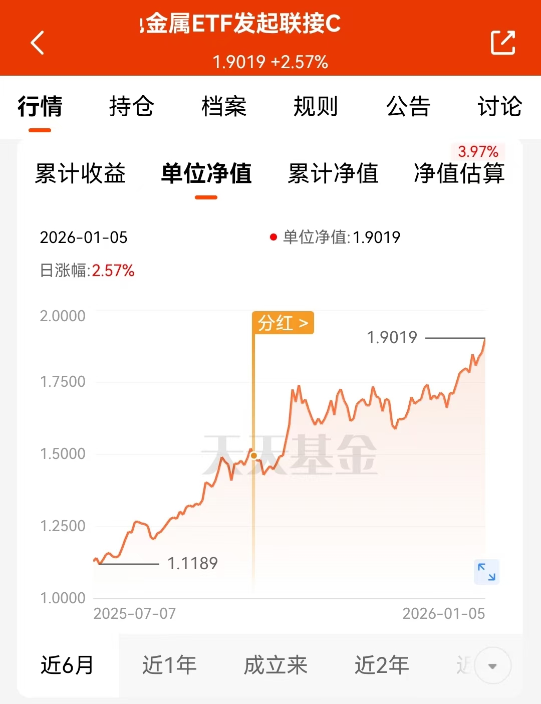 今天买了点$南方中证申万有色金属ETF发起联接C$(004433)。今天预估表现不错。我觉得当前环境对有色挺好的。各种行业信息还乐观,经济周期向上也需要它。这只基金的业绩挺好,近六个月涨了68%,实力说话。我认为值得关注。#【跨年坦白局】提问金梓才、陈果#