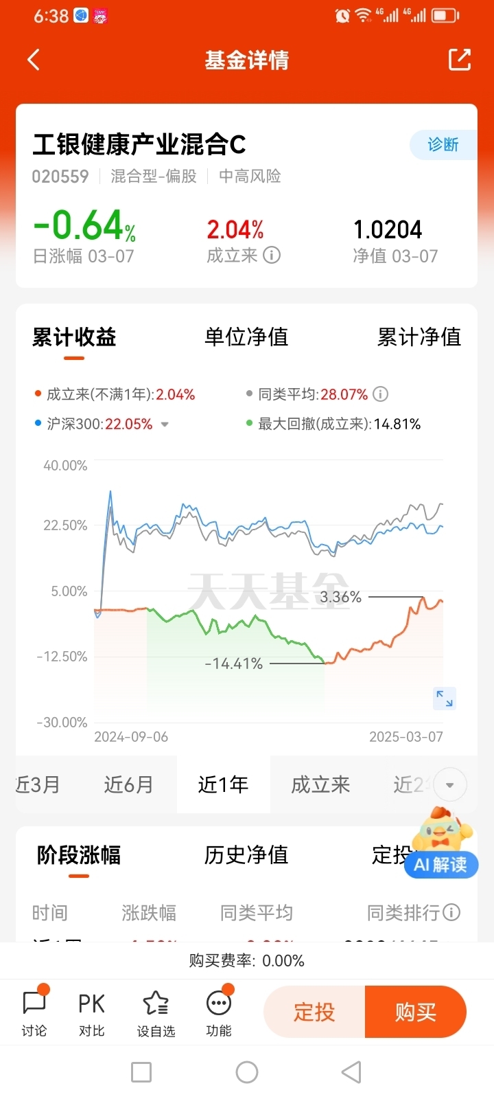 打卡第9天,工银健康产业混合C(020559)近一周呈现先涨后跌态势。3月5日,