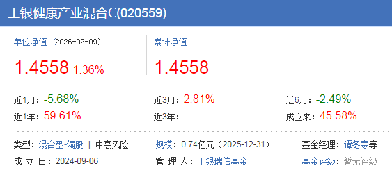 2026年开年,医药领域就热闹非凡,脑机接口迎来技术突破、资本加持、政策赋能三重利好,商业化进程一路狂飙。与此同时,创新药产业链也借着这股东风,迎来了“小阳春”,而$工银健康产业混合C(OTCFUND|020559)$聚焦创新药与AI医疗,正站在这一风口之上。这个基金最近1年的净值回报高达59.61%,表现也是很不错的。