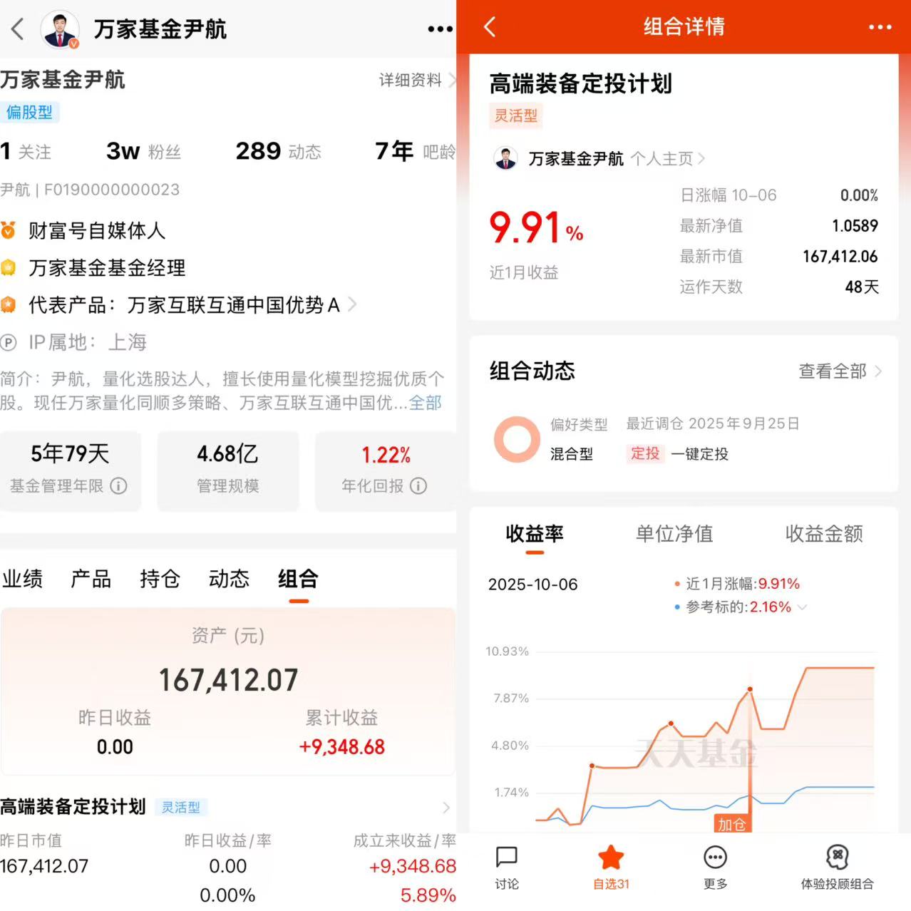 首先,我非常支持本次天天基金网的“基金经理开实盘”活动,由基金经理带路,有专家的支持保障,能够让我们这些在市场震荡中茫然无措的散户投资者们安心很多。而且尹航经理在“高端装备定投计划”组合持续跟踪定投尹航经理自己的科技宝藏基金——万家高端装备量化选股混合发起式(A:020560;C:020561)已累计投入超过十六万元,收益率达到5.89%,这样真金白银的投入更显出陈总对于自己管理产品的自信以及万家高端装备量化选股混合发起式(A:020560;C:020561)的优异表现,因为这既能让投资者看到基金经理对自有资金的实际投资操作,验证其投资策略是否与宣传一致,避免“纸上谈兵”;同时,投资者也可通过学习基金经理的实盘,提升自身投资能力。对于尹航总的“高端装备定投计划”组合,我已加入自选并且在持续关注。