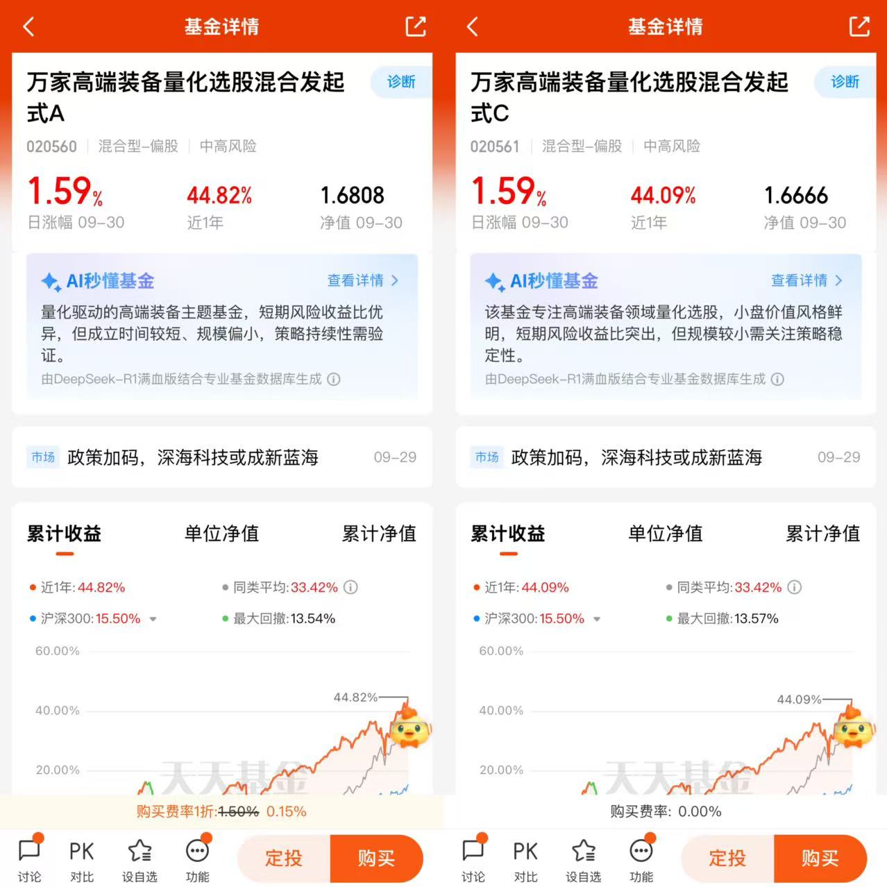 其中最具有代表性的,万家基金基金经理尹航先生的科技成长优选基——万家高端装备量化选股混合发起式(A:020560;C:020561)重点关注高端制造、科技创新等业绩确定性强的板块,采用量化模型精选个股,持股分散度较高,均衡分散风险,直接受益于制造业升级红利、科技行业业绩释放的双重驱动。万家高端装备量化选股混合发起式A(020560)“近1年”阶段涨幅达44.82%,远超沪深300指数的15.5%。