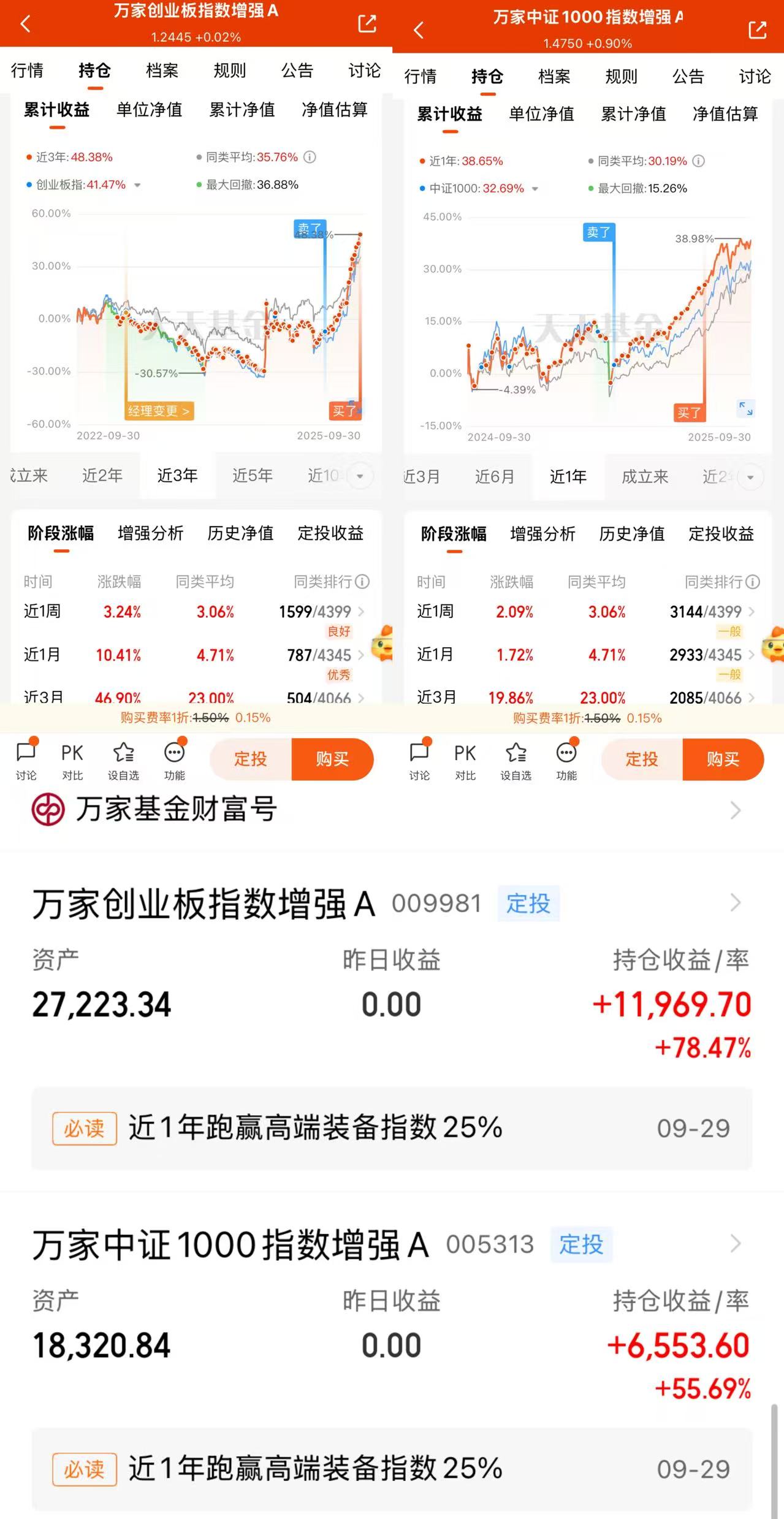 基金公司是基金最坚强的后盾,基金的未来表现必然与基金公司的投研实力息息相关。万家基金管理有限公司成立于2002年,有46位基金管理365只基金,目前管理规模达到了5118.09亿元,本身就是我最欣赏的新生代基金公司之一,业绩表现非常亮眼,我对于万家基金可谓是十分熟悉了。无论是股票基金、债券基金、指数增强基金等收益率都位居行业前列,我坚持借助天天基金网独有的“慧定投”功能坚持定投万家基金明星基金经理乔亮和张永强先生的万家创业板指数增强A(009981)、乔亮经理的万家中证1000指数增强A(005313)将近三年时间,累计投入资金将近6万元,也是我目前持仓最多的权益类基金,且均逆势获得了远超跟踪指数增幅的投资回报,并且我也将坚持定投下去,与万家基金共同成长!