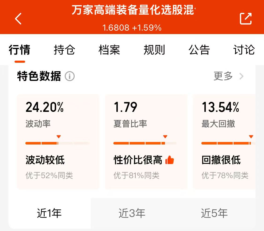 万家基金的尹航经理的万家高端装备量化选股混合发起式(A:020560;C:020561)全面布局A股家用电器、机械设备、电力设备等龙头股,能够充分分享人工智能新时代工业革命下新质生产力飞跃带来的科技板块投资机会。万家高端装备量化选股混合发起式(A:020560;C:020561)“近1年”夏普比率达到1.79,“性价比很高,优于81%同类”;最大回撤只有13.54%,“回撤很低,优于78%同类”。