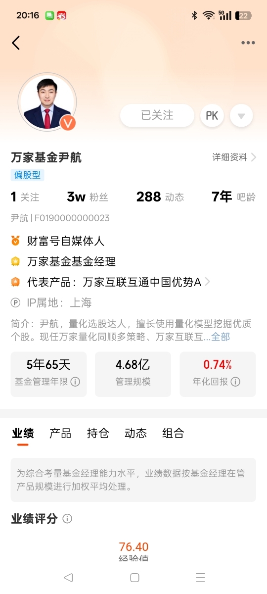 3、实盘理念与投资者契合:尹航秉持 “陪伴式投资” 理念,他承诺以坦诚态度、鲜明观点与持有人休戚与共。其实盘页面信息透明,清晰展示市值、收益等数据,还会高频且真诚地更新动态,包括市场观点、产品运作情况等,让投资者能更好地了解投资逻辑和组合情况,增强了投资者的信任和持有信心。