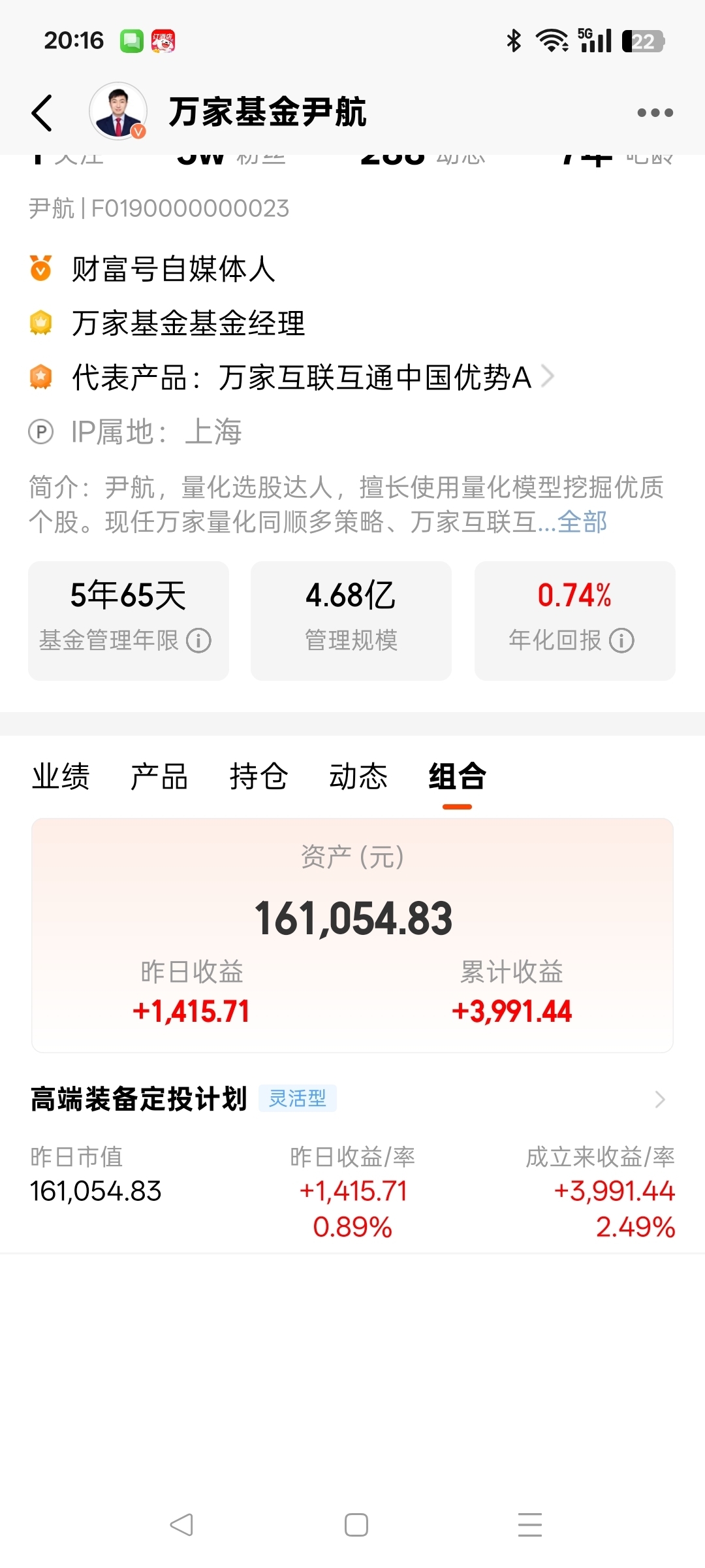 我关注万家基金经理尹航及其实盘“高端装备定投计划”,主要有以下几个理由:1、基金
