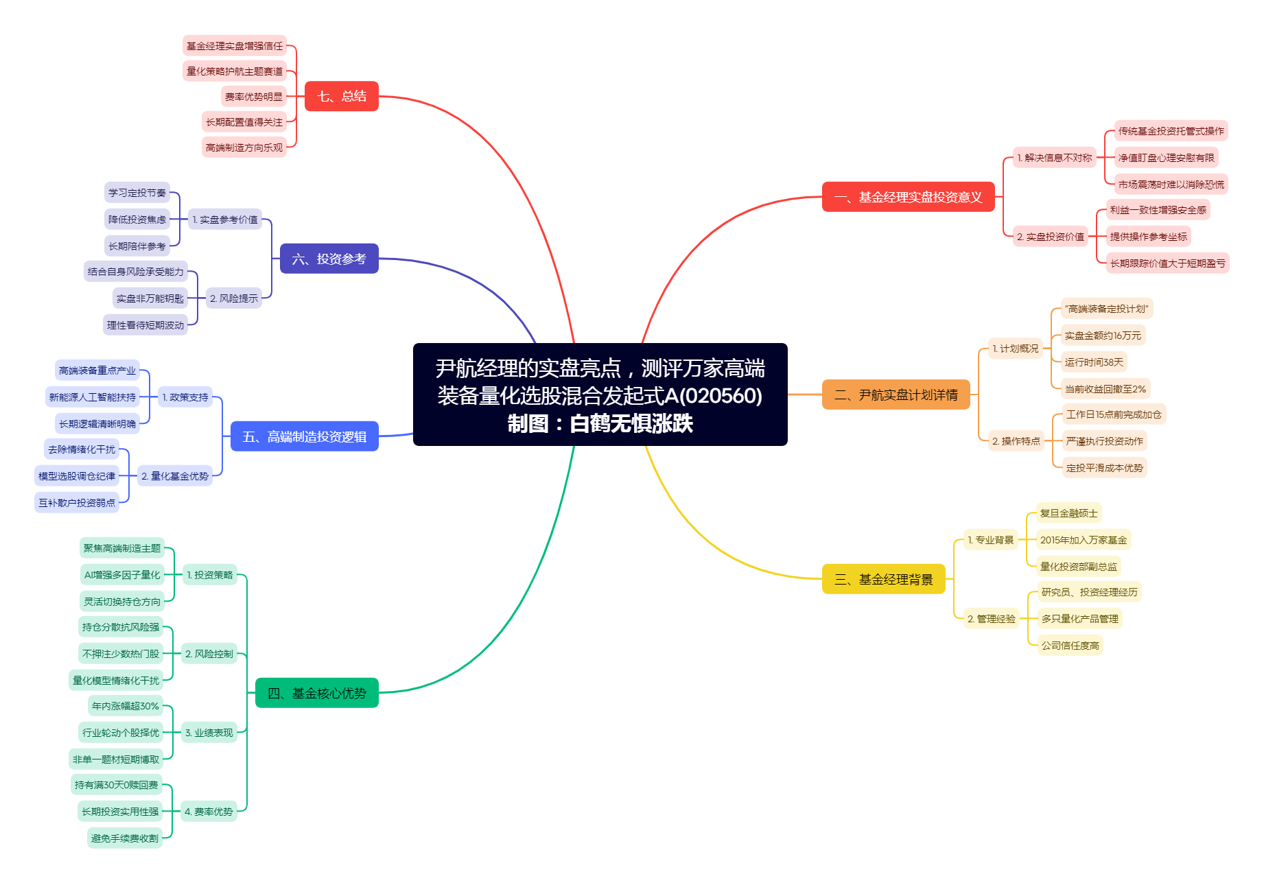 接下来白鹤君就具体谈谈对于“公开实盘”这件事的看法,特别是尹航的“高端装备定投计划”实盘,还有其定投的万家高端装备量化选股混合发起式A(020560)是否值得布局,文章有点长,这里也是做了个思维导图,方便大家整理思路,可以点开放大了看下的。