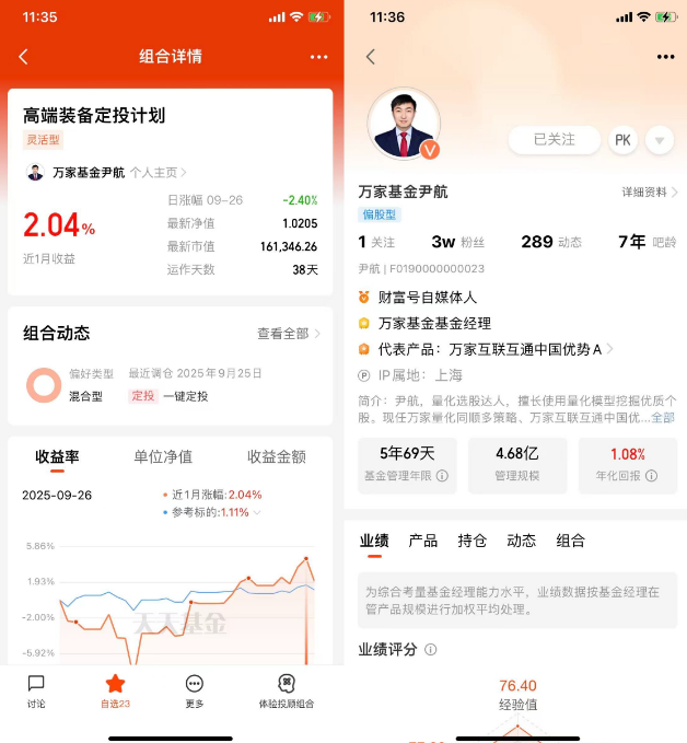 投资基金也很多年了,白鹤君发现很多朋友和我一样,在投资基金的过程中,最纠结的一点就是:信息总是不对称。我们买入基金,基本就是“托管式”的操作,把钱交给基金经理,剩下的就是天天盯净值,看市场涨跌,偶尔听基金经理的直播、路演或者公告里的几句话。但说实话,这些东西大多数时候都是“安慰为主”,能起点心理作用,但真要碰上市场震荡或者净值大幅回撤,心里那股慌劲儿,还是没法完全消散。所以,当基金经理自己开了实盘账户,拿真金白银去买自己管的基金,这个动作就显得特别有意思,比如万家的尹航经理就开启了“高端装备定投计划”实盘。