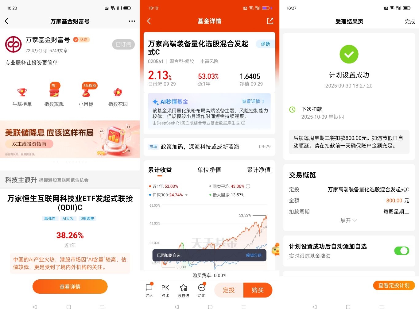 #基金经理开实盘啦# 布局高端装备投资机会,就选$万家高端装备量化选股混合发起式A$,近一年涨53.81%(同类基金平均值43.06%),在4389只同类基金中排名前列。我是万家基金的忠实粉丝,长期定投持有$嘉合磐泰短债C$$万家北证50成份指数发起式C$ $万家中证红利ETF联接C$ $万家创业板指数增强C$ $万家中证A500ETF发起式联接C$ $万家家瑞债券A$ 等,对收益回报和持有体验感到非常满意!