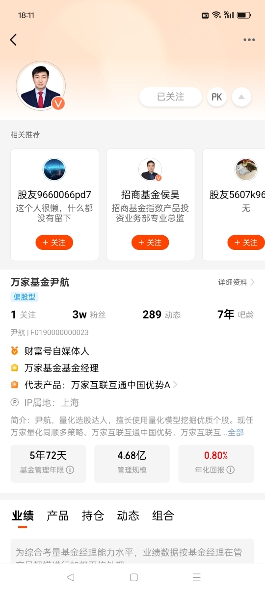 我关注基金经理尹航的理由:尹航经理现任万家基金量化投资部副总监,拥有12年研究及投资经验,其中8年投资管理经验,擅长使用量化及系统性方法,捕捉市场趋势,开发出受益于资本市场趋势的量化策略,在投资管理中成效显著,给持有人带来了很好的回报和体验。