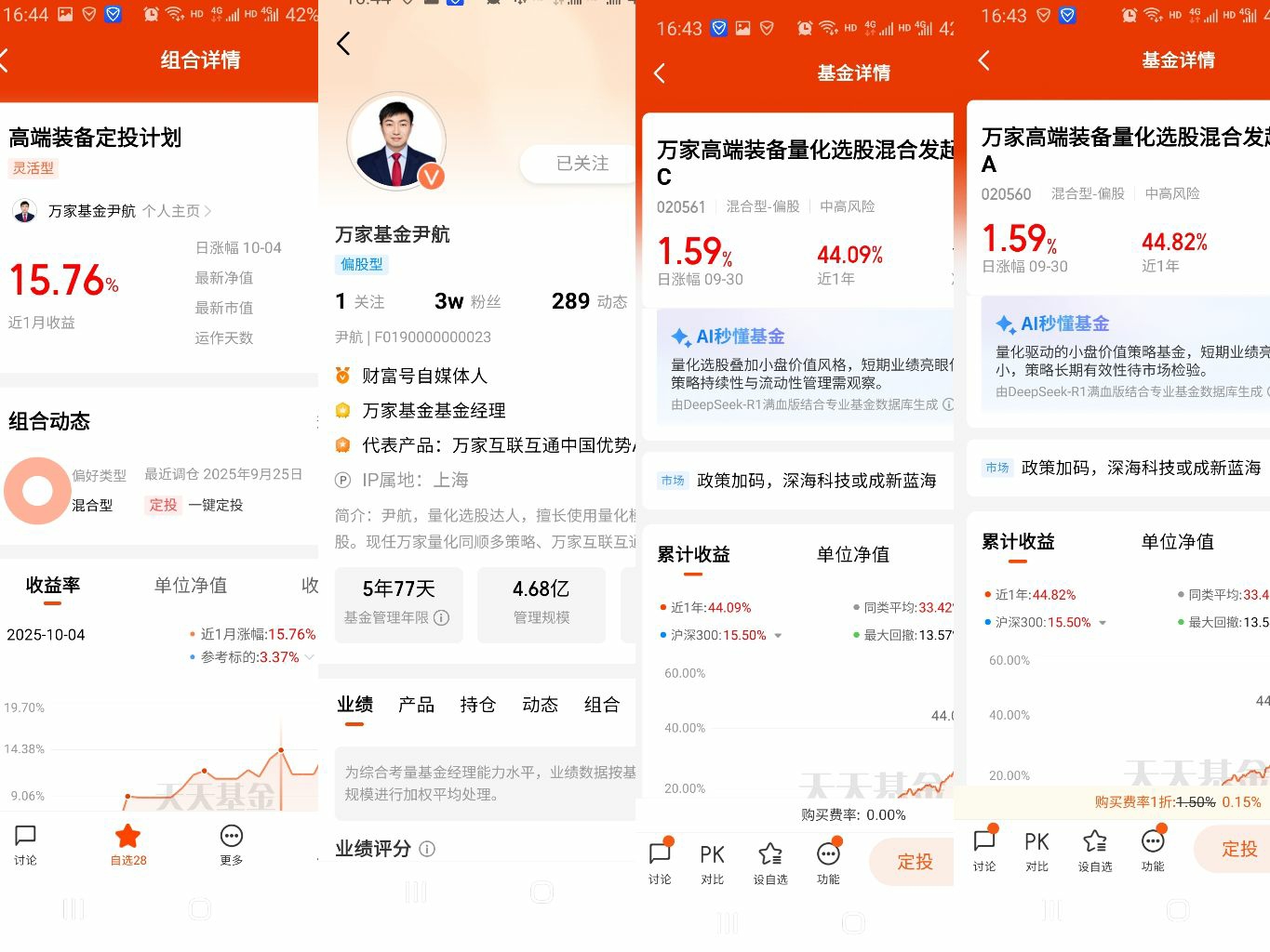 $万家高端装备量化选股混合发起式A(020560)$成立于2014年1月,是尹航经理一手打造,精选布局高端装备制造主题的基金,成立以来,收益率达到68.08%,非常优秀!