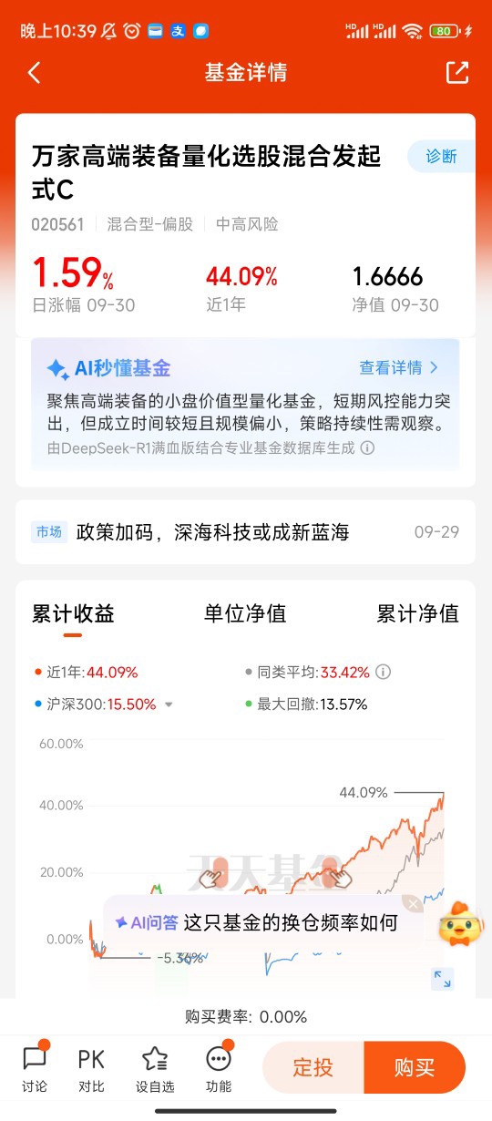 紧盯实盘组合,是看重其“稳中有进”的策略优势。尹航的实盘核心是“高端装备定投计划”,这个组合精准踩中了产业升级的时代主线,聚焦氢能源、AI、卫星等新质生产力领域,与中国制造业转型趋势高度契合 。支撑这个组合的,是他打磨多年的量化策略:通过高频数据捕捉市场微观结构,用动量与反转效应筛选个股,在大小盘与价值成长风格间动态平衡,再以分散持仓降低单一风险 。从业绩来看,他管理的万家高端装备量化选股混合A在多阶段均能跑赢中证高端装备制造指数,即便在2020年7月至2023年底的震荡市中,仍能跑赢基准10个点 。这种“控制风险前提下力争超额”的思路,恰好击中了普通投资者“怕亏、求稳”的核心需求。
