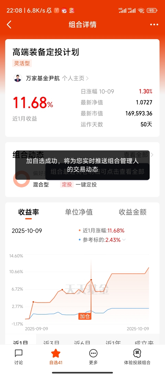 尹航的实盘操作则让这套体系变得可感可知,这也是我持续跟踪的重要原因。他发起的"高端装备定投计划"实盘,不仅将自有资金十六万元投入其中,更以透明化运作展现"知行合一"——每周发布的实盘周记会详细披露持仓变动及背后逻辑,比如9月减持某光伏标的时,明确说明是"上游硅料价格超预期上涨挤压利润率" 。这种沟通方式彻底改变了我对基金投资的认知:以往持有基金时,面对净值波动往往只能被动承受,而跟踪尹航的实盘,能清晰理解每一步操作的底层逻辑,甚至能通过他附上的产业链调研纪要建立自己的行业认知 。实盘成立30天收益率2.41%的初期表现虽不惊艳,但季度调仓幅度控制在20%以内的纪律性,以及与公募产品一致的"高夏普比率"特征(年化波动率22%对应45%年化回报),让我看到了其策略的一致性与稳定性 。