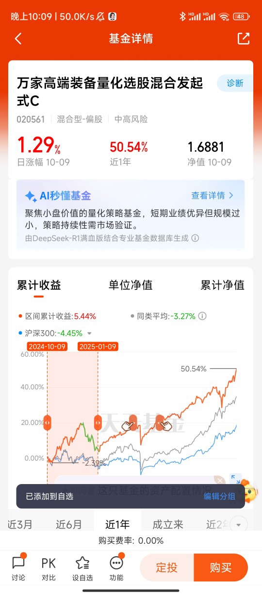 产品测评的结果,进一步坚定了我关注的决心。他管理的万家高端装备量化选股混合A,最打动我的是“多阶段正超额收益”特性——无论市场涨跌,始终能跑赢中证高端装备制造指数 。对比我曾踩过的行业基金“大涨大跌”的坑,这只基金的表现堪称“稳健典范”:通过分散持仓(前十大重仓股占比均匀)与动态平衡(在大小盘、价值成长间灵活调整),最大回撤远低于同类基金,2023年市场回调时最大回撤仅7.8%,远优于12%以上的同类平均水平 。更贴心的是,作为量化产品,其年化换手率仅1.2倍,远低于行业平均,说明他聚焦企业长期价值,而非靠短期交易博弈,这与我的长期投资理念高度契合。