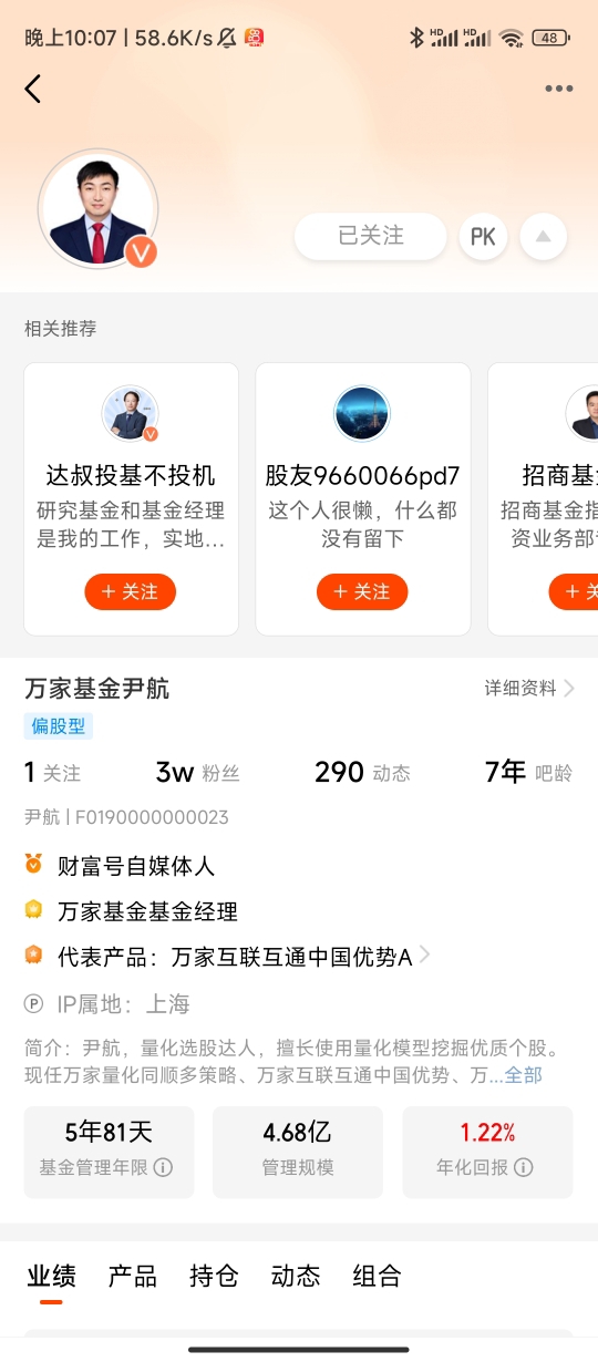 在基金投资的浪潮中,我关注过不少经理,但能让我持续紧盯实盘动态的,万家基金的尹航是为数不多的一位。这份关注并非跟风,而是源于对他专业背景的认可、产品业绩的验证,以及持有过程中积累的信任感,每一点都让我觉得“值得长期追随”。