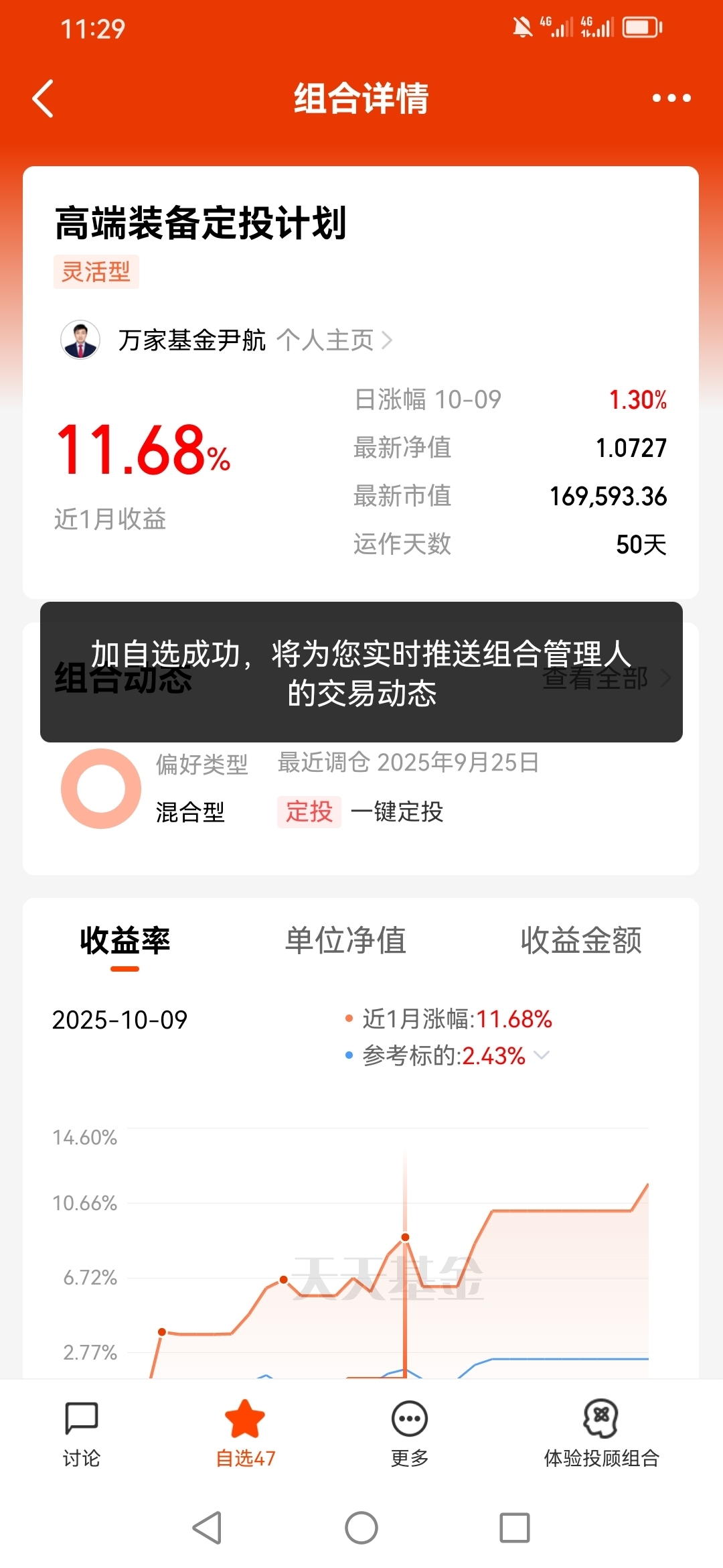 #基金经理开实盘啦# 基金经理开实盘是利大于弊的,因为通过实盘我们可以在更短的时候看到基金经理的操作,从而知道目前基金经理的投资策略是什么,而这样的好处就可以降低信息的不对称(因为基金经理管理的基金产品它是要每三个月才公布一次持仓),而且在做实盘的时候,基金经理会更倾向于研究公司的基本面,而且还会更加注重资产的回撤率,而且基金经理的实盘操作能推动行业淘汰“纸上谈兵”者,也让投资者能真正的了解到基金经理的真本事,因此我把万家基金的基金经理尹航的实盘组合高端装备定投计划这款组合加到了自选,我相信尹经理是一位值得信赖的基金经理。@万家基金