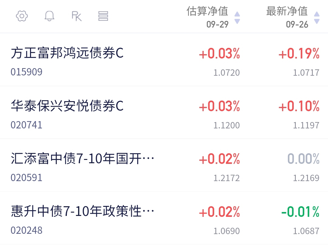 今天的债市依然是红色的,继续回暖!其实别看前两天回暖但是目前利率点位依然是处在比较合适的布局区间,十债也是在接近1.8%的位置上。看看盘面,利率债涨幅很不错,10年红0.25个BP,超长红0.8个BP,今天超长债应该还是一个恐龙蛋打底。信用债开盘比较一般,交易不是很活跃。我猜$方正富邦鸿远债券C$ 今天能收到15-20,久期高的话在回暖行情下确实很占优势,前面两天56个蛋也是最多的。$汇添富中债7-10年国开债E$ 预计3-8个蛋,0-5年的预计1到3个蛋,利率债指数基的话就是回血能力差一些。按照目前的状态看,央妈净投放加上四季度可能出现的降准降息让债市做多情绪又回来了,不过我还是希望今天继续拉升,节前这两天都好过一些!#老登股VS小登股!业内大佬“激辩”#
