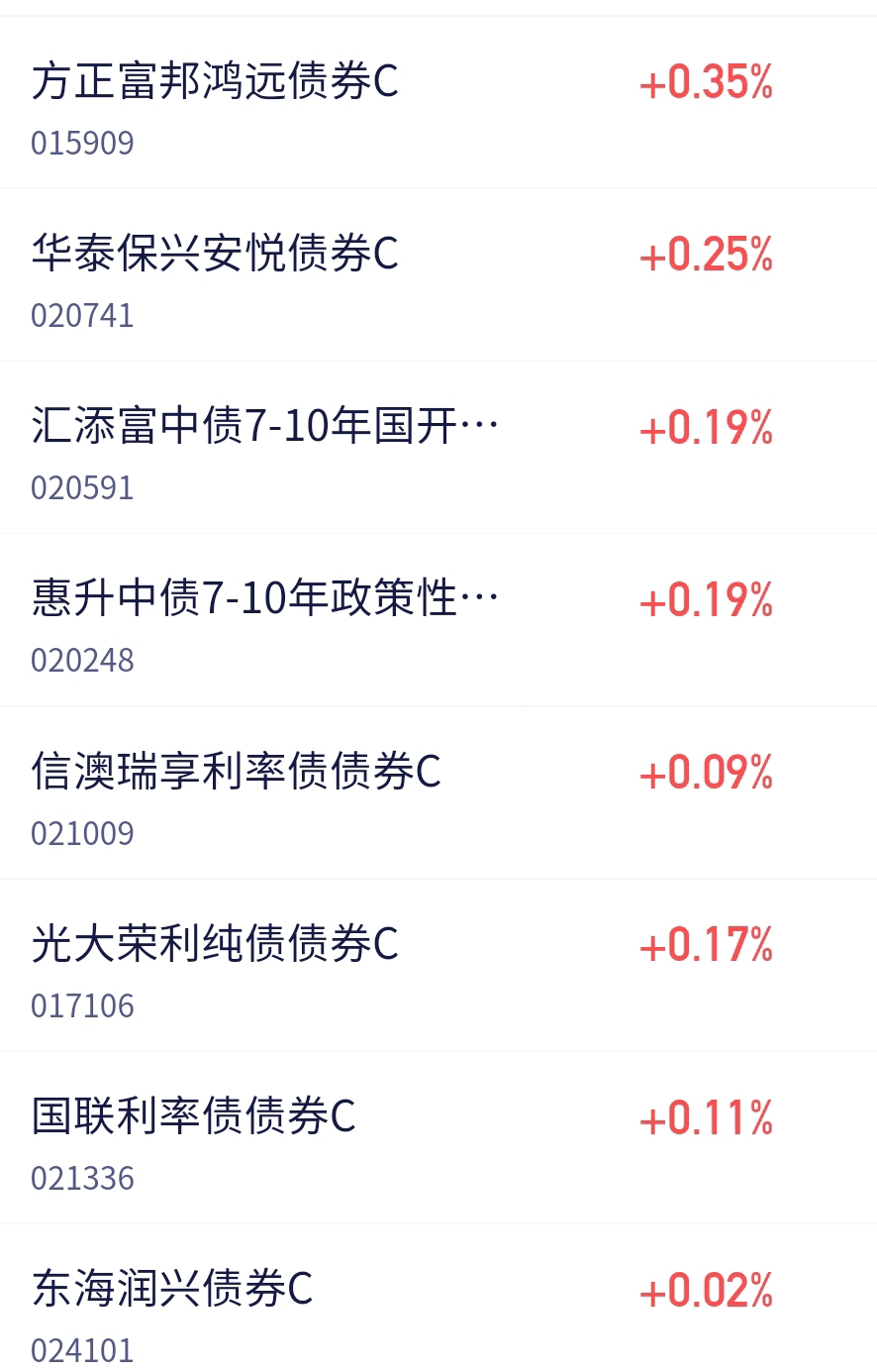 还在拉升?今晚是超级大蛋夜!!利率债直接全线飘红领涨,这波行情,必须来跟大家念叨念叨~看看盘面,利率债涨幅很不错,10年红0.45个BP,超长红2.8个BP,我感觉今天应该能收蛋了吧。信用债目前还是比较弱势,主要还是流动性差一点。我猜$方正富邦鸿远债券C$ 今天能收到60-65,久期高的话在回暖行情下确实很占优势,最近收蛋也是最多的。汇安估计到38-43个蛋左右吧,最近都比方正涨得少。$汇添富中债7-10年国开债E$ 预计3-5个蛋,0-5年的预计1到3个蛋,利率债指数基的话就是回血能力差一些。按照目前的状态看,资金面的宽松加上基本面的偏弱,债市后面机会还是比较大的吧,今天继续拉升,让我多回回血啊!#沪30年国债#