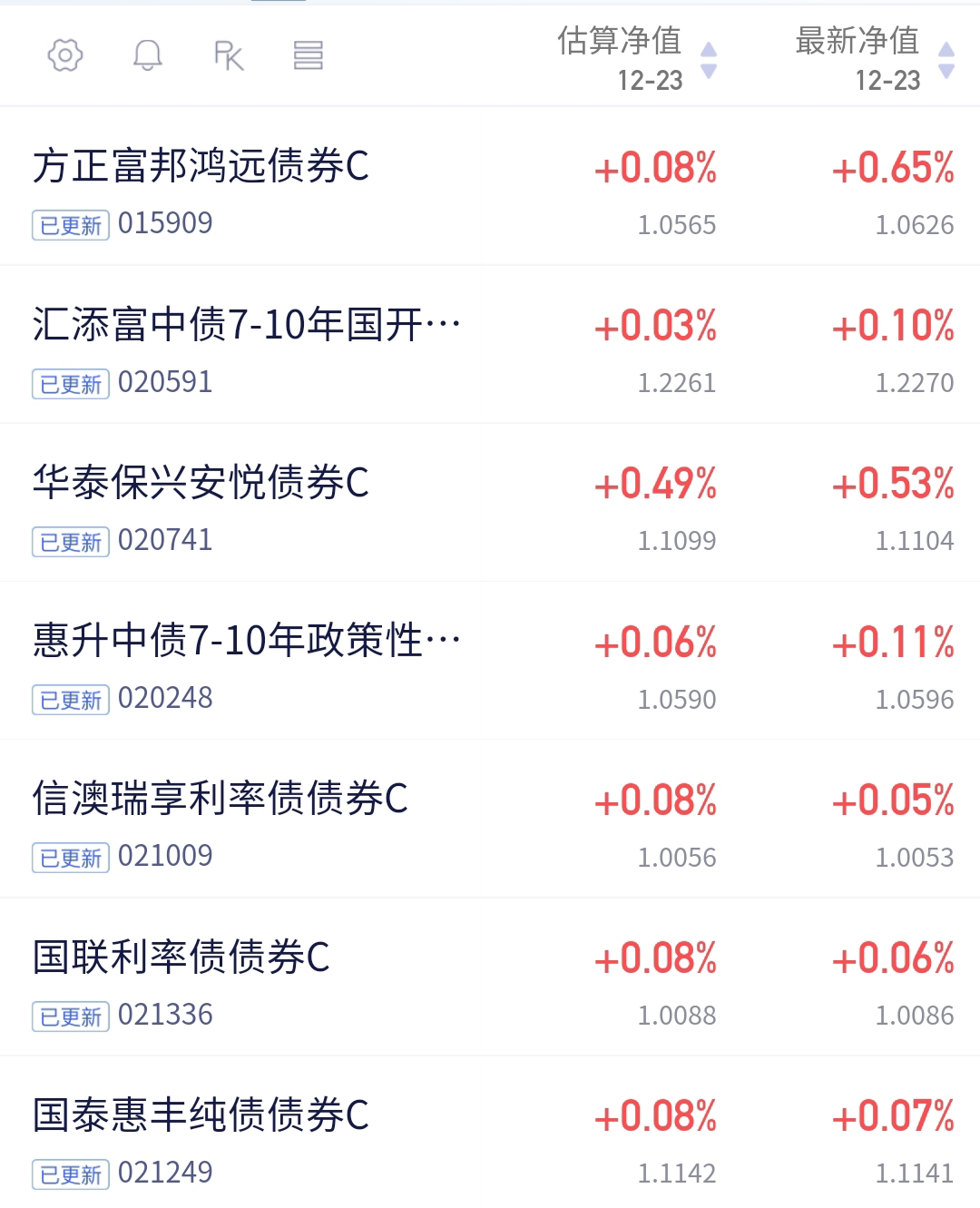 今天债市温和反弹,利率债全线飘红。3-5年收了4-6个蛋,久期略长的组合轻仓收45+,重仓超50,另外一只信用债基也涨了5个,$方正富邦鸿远债券C$ 收了65个蛋,整体持仓暖意融融,比昨天强多了。