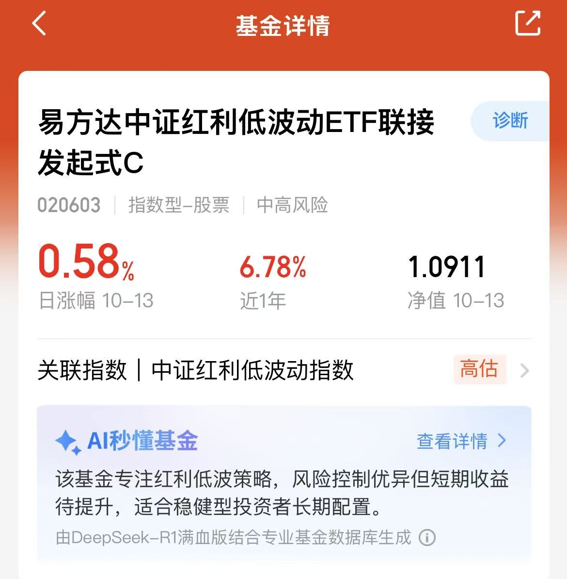 今天A股高开低走,板块轮动的比较快,而且也分化明显,这几天波动比较大呢,像科技方向震荡加剧了,所以操作上我也是偏向稳健的传统红利资产,$易方达中证红利低波动ETF联接发起式C(OTCFUND|020603)$昨天上涨0.58%,是稳中有进的类型的,适合长期持有,尤其像我这样平时工作忙,没时间经常调仓,业绩上也是不错的!