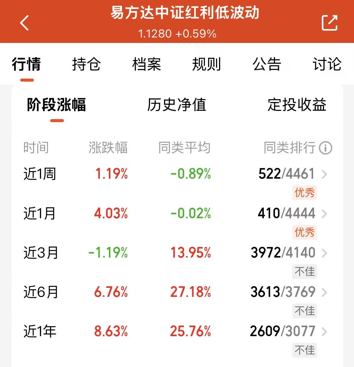 今天大盘又是震荡调整,三大指数均绿油油的,科技还是回调了,不过传统类资产今天继续上涨,比如红利表现不错呀,$易方达中证红利低波动ETF联接发起式C(OTCFUND|020603)$估值上涨0.6%,紧密跟踪指数,市场有银行,交运等板块,年化收益率8.63%,回撤小波动小,长期持有不错的,特别是科技震荡时期,市场很大可能会出现高切低的现象,所以我今天也继续补仓位了,耐心的持仓待涨!