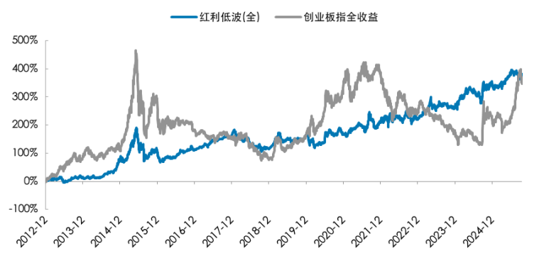 红利低波指数与创业板指的长期累计收益比较(全收益)