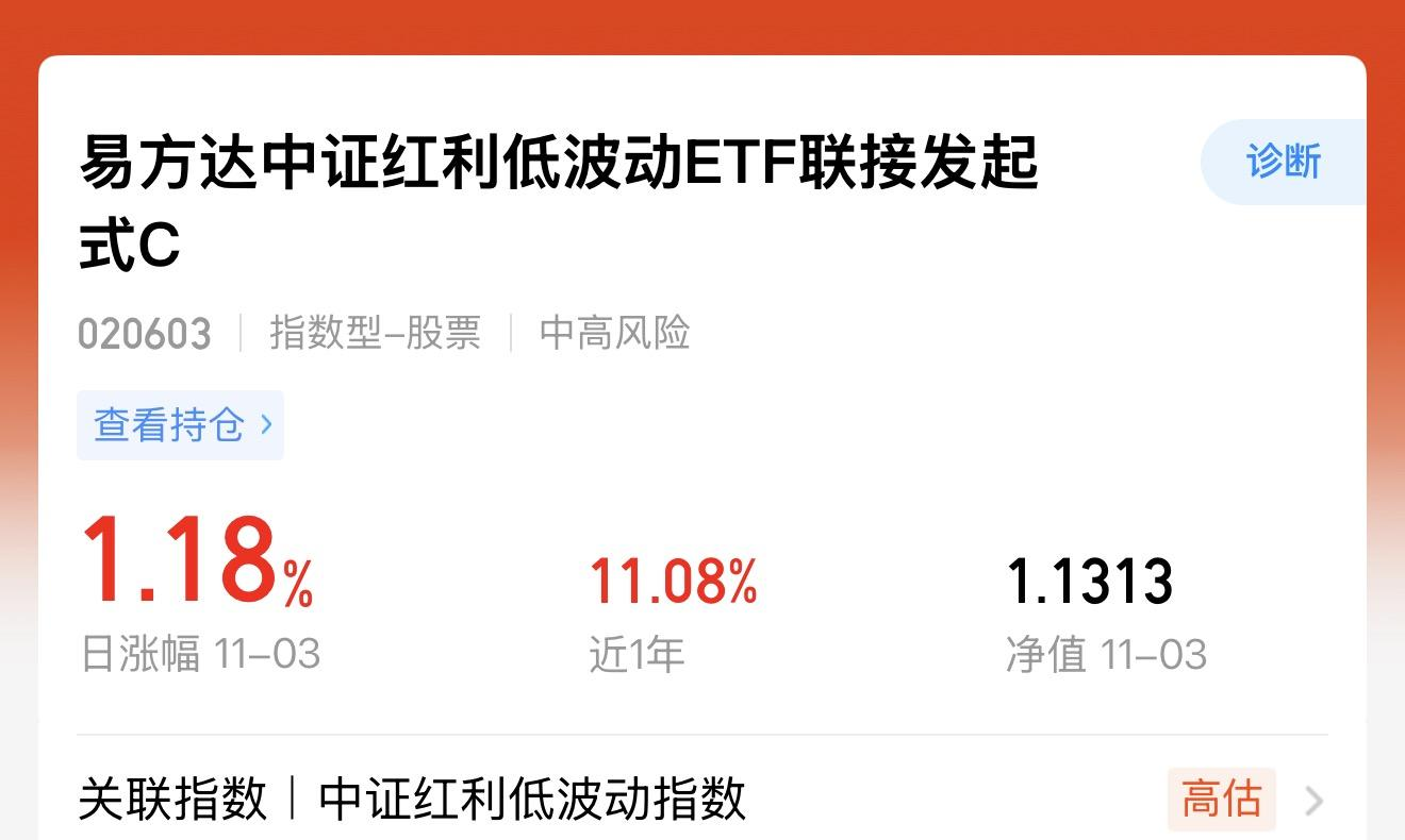 而$易方达中证红利低波动ETF联接发起式C(OTCFUND|020603)$主要是跟踪中证红利低波动指数,聚焦了银行、煤炭、交运等方向,持仓比较分散,具备高股息、高分红的特点。从业绩来看,近1年涨幅达到了11.08%,表现优秀。现在市场资金避险情绪高涨,榕哥先加自选了,后续也会找机会继续配置的!