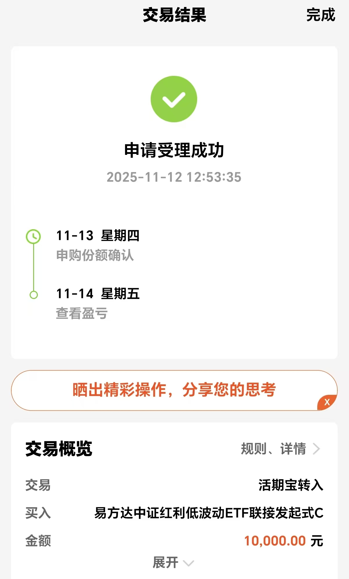 当前大盘在4000点上下波动,短线走势很难把握,这个时候我感觉配置一些红利基金还是能够有效低于市场波动的。对了,$易方达中证红利低波动ETF联接发起式C(OTCFUND|020603)$综合费率比较低,也可以在一定程度上降低成本,也是我们在购买红利基金需要重点考虑的一个方面。我今天选择上车一些,朋友们可以根据自己的偏好配置或者关注产品,择机上车,像是保守型,可以配置70%红利+30% 成长,稳健型配置50%红利+50%成长,进取型配置30%红利+70%成长。