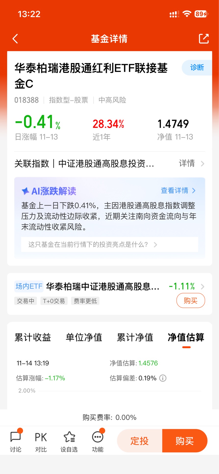 行情这波动真有点“上头”,昨天涨得欢今天就蔫了,谁也摸不准下一步咋走。今天港股红利板块虽然小跌,但至少没跟着猛跌,这种抗跌性现在太刚需了。眼瞅四季度收尾,今年挣的那点钱可不能再“过山车”了——我把手里的高波动仓位换了点华泰柏瑞的产品,毕竟港股红利这种方向,股息给得实在,就算行情晃,收益也能靠股息“垫”着,现在就想把今年的收益稳稳揣兜里,这产品刚好能对上这个需求。$华泰柏瑞港股通红利ETF联接基金C$ #多重利好催化!新能源走强#