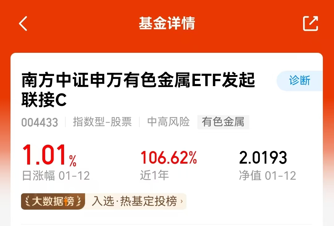 我又买了点南方中证申万有色金属ETF联接C(004433)。有色板块强势不改,贵金属价格稳步上行,行业公司业绩亮眼,行情热度高。之前找矿行动成效显著,2026年找矿行动继续推进,行业资源基础更稳固。基金近一年涨106%,多个阶段收益不错,超额收益明显#商业航天大幅调整 止盈信号还是倒车接人?#