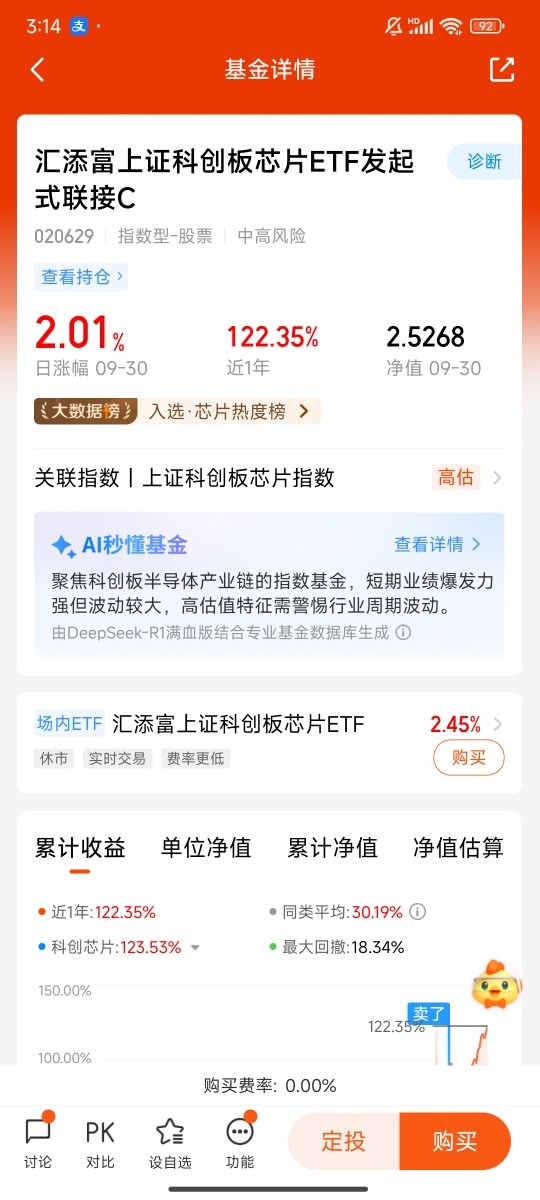 反正凡事自有10月9日开盘后再说,这份彻底躺平的淡定,一半来自对A股节后走势的笃定,另一半,全藏在我手里的汇添富上证科创板芯片ETF联接C里。
