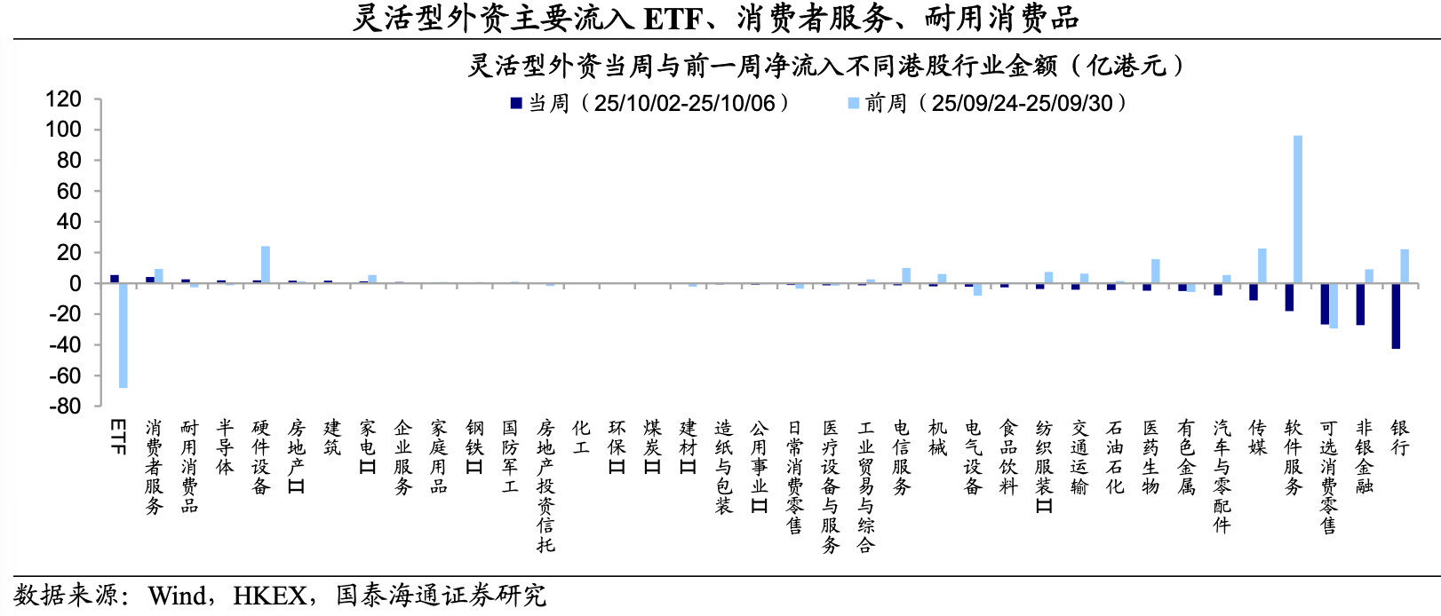 上周两个交易日,北向资金整体小幅净流出,且科技与红利分歧仍在延续。国泰海通证券研报显示,稳定型外资主要流入医药生物、非银金融,流出耐用消费品、房地产、电信服务;而灵活型外资主要流入消费者服务、耐用消费品,流出银行、非银金融、可选消费零售。从历史走势来看,当市场波动明显放大期间,传统价值板块补涨概率较高。