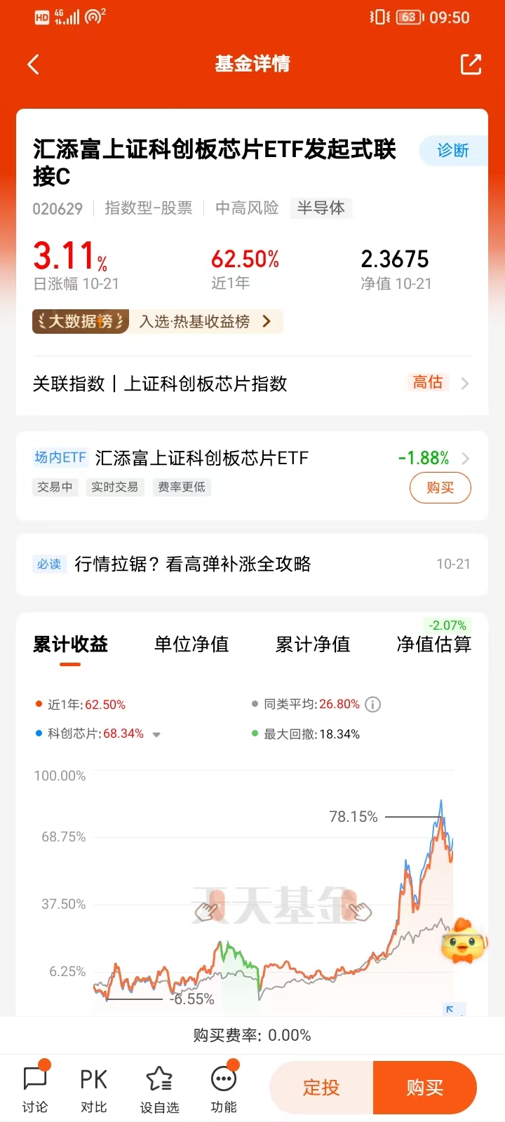 汇添富上证科创板芯片ETF联接C(020629)成立于2024年3月12日,该基金跟踪上证科创板芯片指数,采用”母基金+子基金”运作模式,主要投资于科创板芯片生态(设计/制造/封测/材料设备)。基金近一年表现亮眼,净值增长率达62.50%,远超同类平均26.80%,排名89/3071,在复制指数型基金中位居前列。但需注意,基金成立时间较短,历史业绩可能无法完全反映长期风险收益特征。