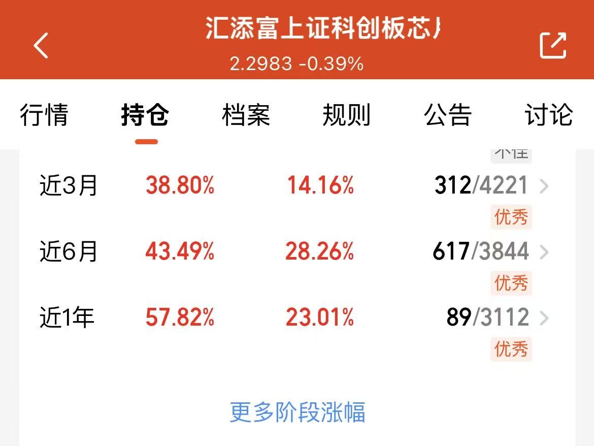 $汇添富上证科创板芯片ETF发起式联接C(OTCFUND|020629)$是一键打包芯片行业龙头的,20CM涨幅高弹性,费率更低,近三个月涨幅38.8%,近一年涨幅57.82%,业绩出色,优于同类,不管是短期持有还是长期持有,都是不错的,眼下行情在慢慢的反弹了,我继续持仓待涨,坐等更美好的收益。