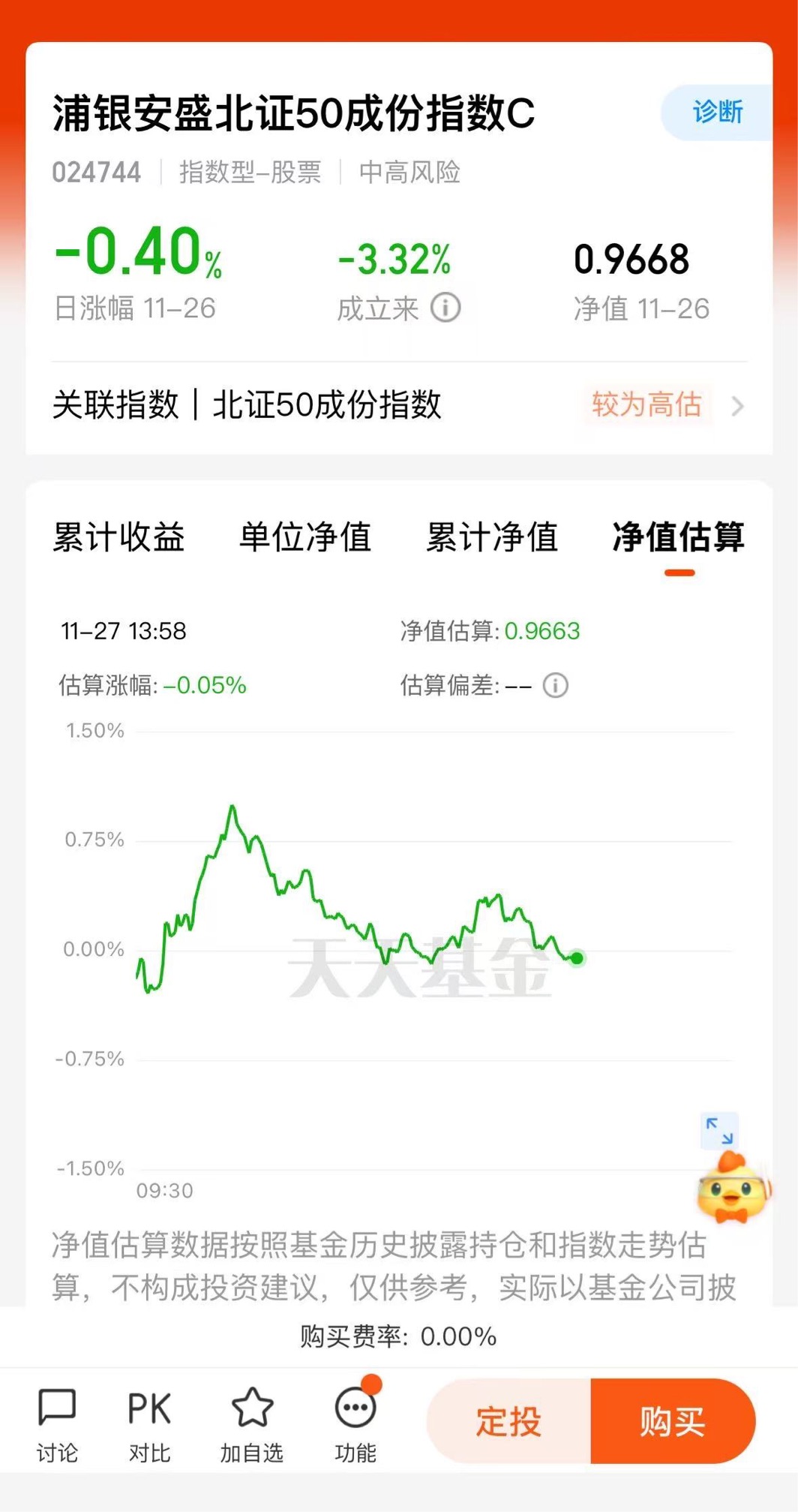 浦银安盛北证50跟踪紧密,后面额度只会越来越紧张,不限购的北证50操作起来$浦银