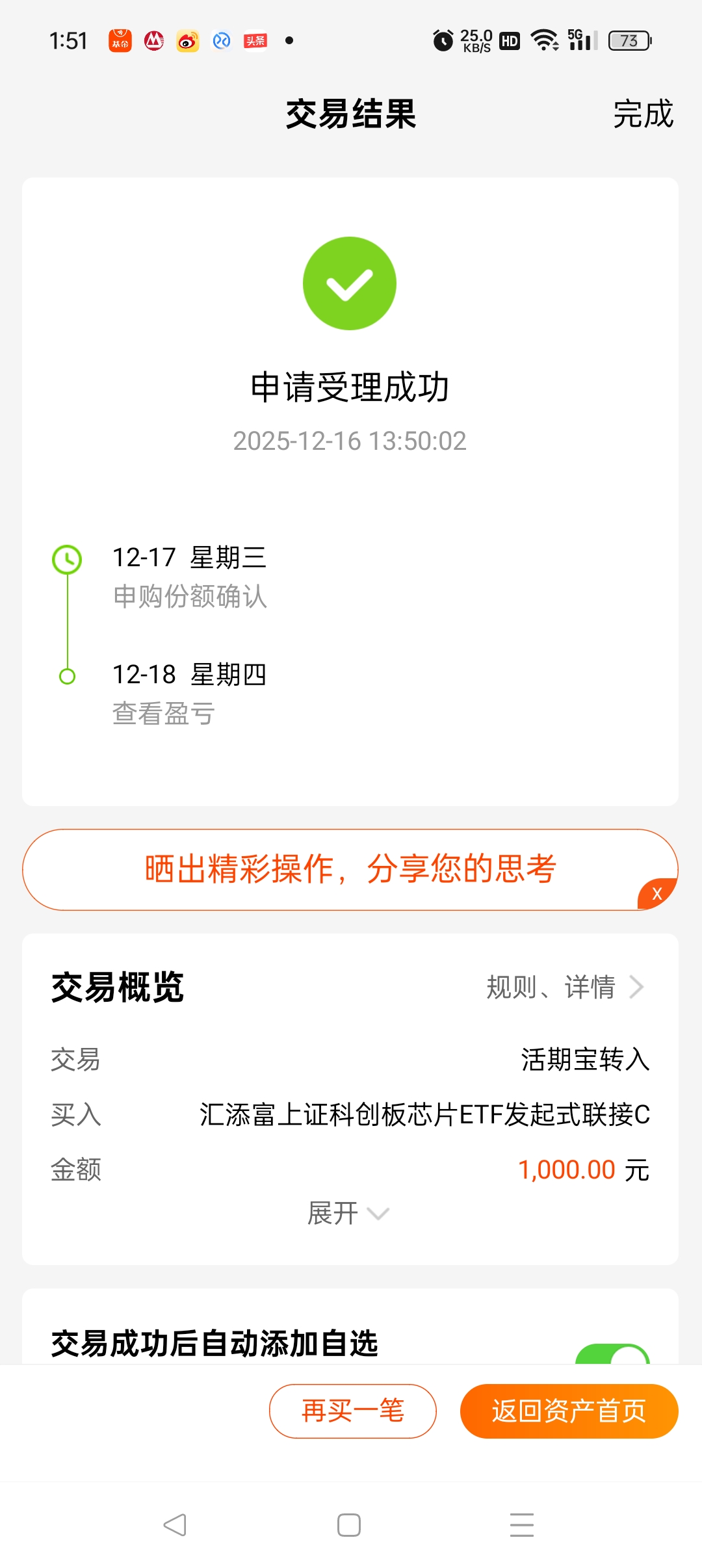 近期受到热捧的存储芯片概念相关公司被券商密集调研。临近年末,多家券商在本周发布2026年度策略,券商普遍认为,科技板块仍是最看好的明年主线之一!现在科创芯片板块回调正是布局的好时机,先行买入先行$汇添富上证科创板芯片ETF发起式联接C(OTCFUND|020629)$1000块,那么接下来如果有回调的话,猴哥再次会加仓!相关基金:$汇添富上证科创板芯片ETF发起式联接C(OTCFUND|020629)$