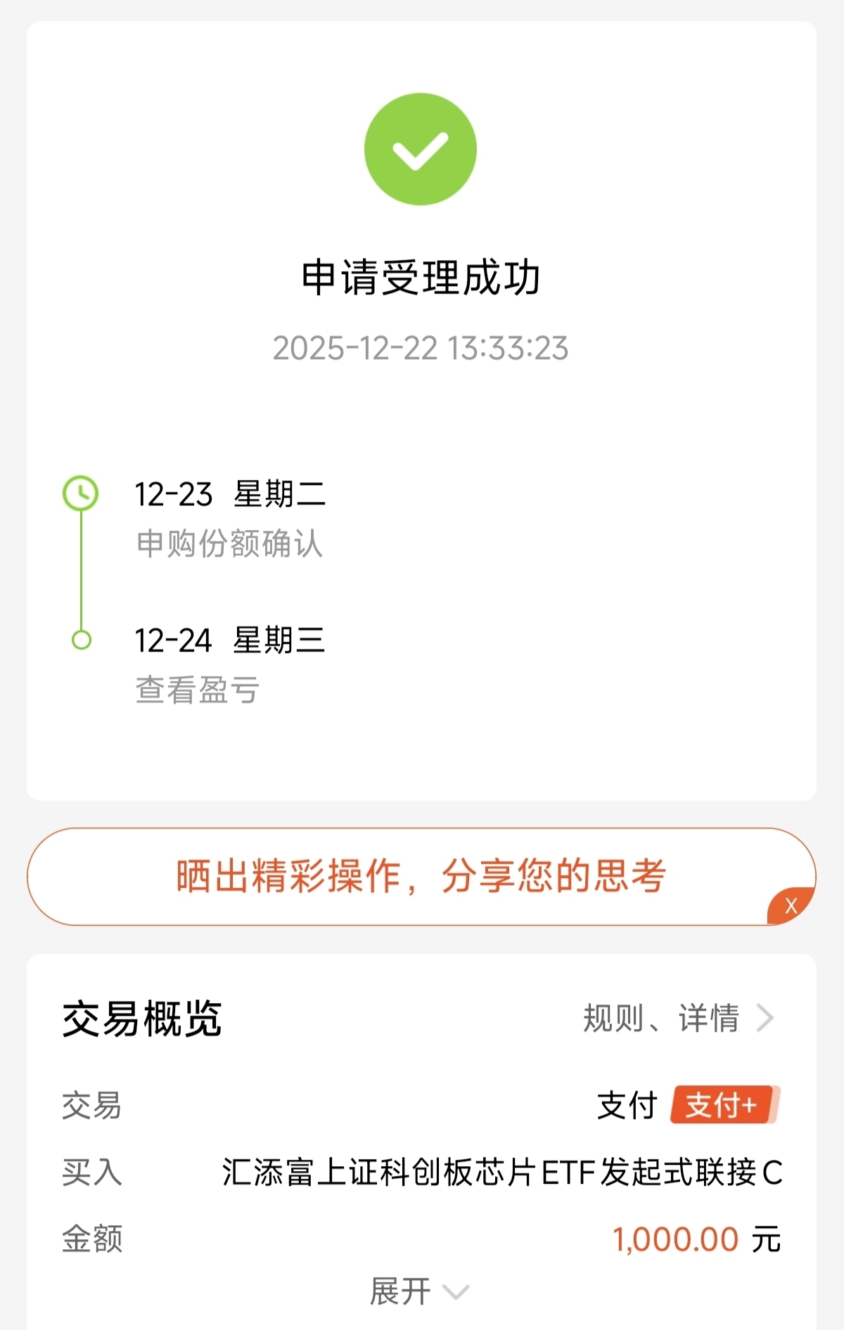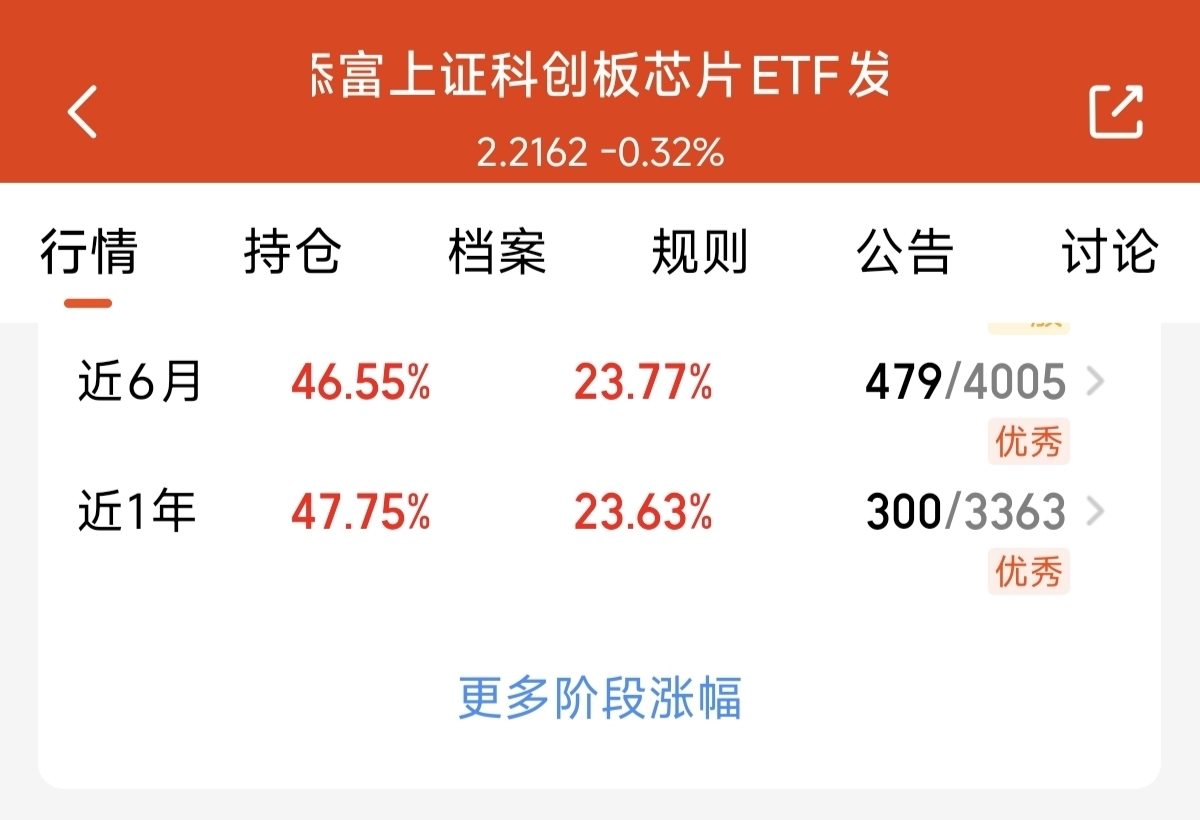今天我有关注到$汇添富上证科创板芯片ETF发起式联接C$ 聚焦科创板芯片的指数基金,紧密跟踪上证科创板芯片指数,半导体核心环节占比约95%,覆盖设备、材料、设计、制造全链条,聚焦寒武纪、中微公司、澜起科技、中芯国际等科创板芯片龙头!而且标的指数仅选科创板芯片股,有20%涨跌幅,上涨起来弹性更大,而且指数还是季度调仓,上市满6个月即可纳入,能快速把握新科技的成长优势!基金紧跟指数的精准度高,近半年上涨了46.55%,近一年上涨了47.75%,而且是指数化全产业链的投资,受单一个股单一环节波动影响也比较小,长期稳定性也比较好!目前来看,芯片半导体新一轮行情已经开始启动,而且经过前期回调,估值低,我今天底部加上1000开始布局!