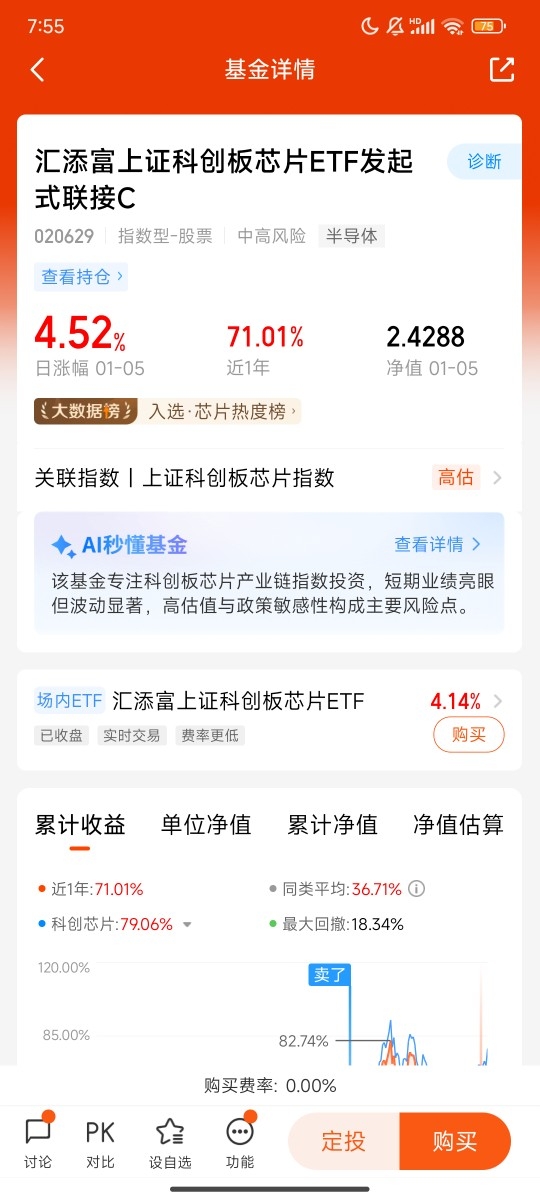 汇添富上证科创板芯片C是我单独配置的一只高弹性基金,持有体验可谓五味杂陈。最初入手是看中芯片行业的长期发展潜力,毕竟国产替代和技术升级是大趋势。持有期间,它的高弹性特质展现得淋漓尽致——行业利好政策出台或技术突破时,净值能在短期内快速拉升,那种收获的喜悦让人印象深刻。但反过来,芯片行业集中度高、受政策和市场情绪影响大,波动也远超普通基金。有过短短几天净值大幅回撤的经历,也有过长期横盘震荡的煎熬,这让我深刻体会到高成长赛道的“双刃剑”效应。