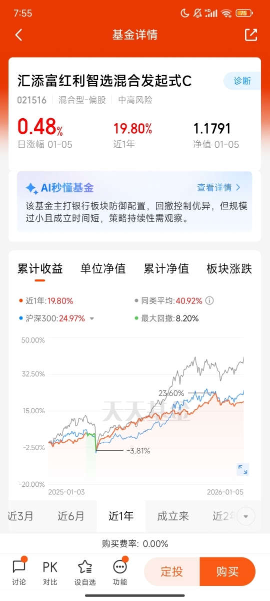 哑铃的一端,是用来筑牢安全垫的防御型资产,汇添富红利智选混合发起式C就承担了这个角色。这类资产的核心特质是稳健,不求短期爆发,但求长期靠谱。这只基金聚焦红利赛道,持仓多是经营稳定、现金流充裕且有持续分红记录的企业,它们就像投资组合里的“压舱石”。市场波动剧烈时,它们凭借扎实的基本面和稳定的分红,能有效缓冲整体组合的回撤,让我不用在行情震荡时过度焦虑。持有期间,即便大盘大幅调整,这只基金的净值波动也相对平缓,这种稳稳的安全感,正是防御端资产该有的样子。