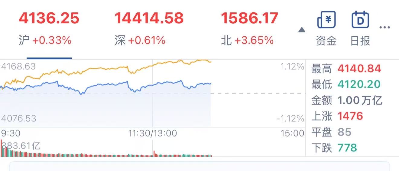 今天A股高开高走,盘中冲高回落后一直微弱震荡,目前还是保持在4130点附近,两市预计成交2.94w亿,较昨天放量2300亿,上涨近3700支个股,99家涨停,赚钱效应非常好的,光伏设备、商业航天、贵金属等领涨市场!话不多说,关注小元,带你抓住行情机会,把握住这波吃肉的机会。