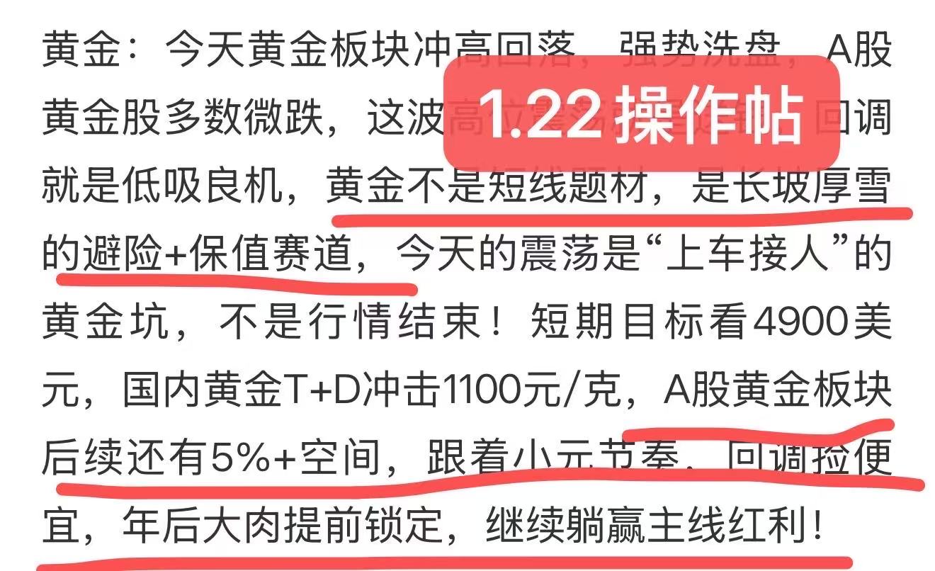 黄金:家人们!小元封神预判又又又炸了!小元昨天说过黄金板块后续还有5%+的空间,今天就直接暴涨近3%,今天直接起飞,国际金价狂飙破历史新高,A股黄金股全线爆拉,吃肉吃到爽到飞起,小元强调了很多次黄金是避险+通胀双逻辑,周线看涨趋势无敌,这波精准拿捏,跟着的家人全吃肉吃到爽!小元今天看来还是坐稳扶好,现在的黄金资金疯抢、热度拉满,主升浪才刚起步!