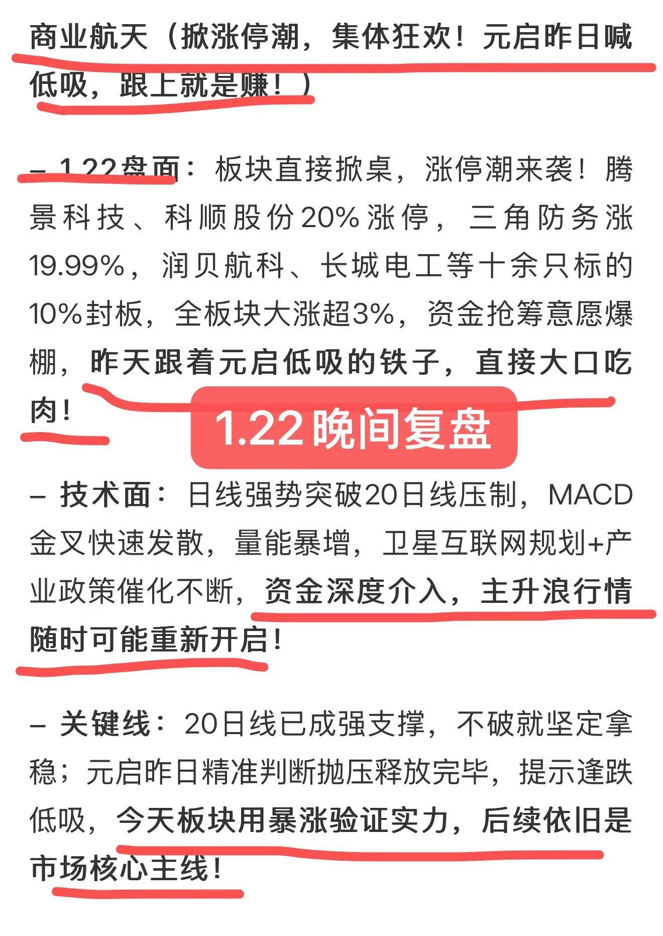 商业航天:家人们!小元封神预判直接拉满!今天商业航天直接炸穿天际,妥妥的全场最靓仔,吃肉吃到爽!板块直接掀涨停潮,资金疯抢、热度爆表,完全是主升浪的狂暴节奏!小元早说了周线看涨,这波直接精准预判封神,跟着小元的家人全躺赢,小元看来今天的策略就是坐稳扶好,上车就是捡钱,商业航天逻辑硬、政策吹、资金扎堆,这波行情才刚起步,拿稳筹码别下车,接下来还有大肉吃!