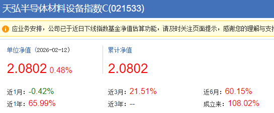 半导体,这会看涨幅回落至1.2%左右,$天弘半导体材料设备指数C$ 继续持仓吃肉喽!消息面上,2月12日M股盘后,应用材料发布2026财年Q1业绩及Q2指引,核心超预期点是Q2营收指引高达76.5亿美元,远超H尔街预期的70.3亿美元!同时CEO明确表示2026自然年半导体设备业务将增长超20%,并预测全球半导体产业收入将在2026年达到1万亿美元,较此前预测大幅提前,或会刺激行情继续上涨。