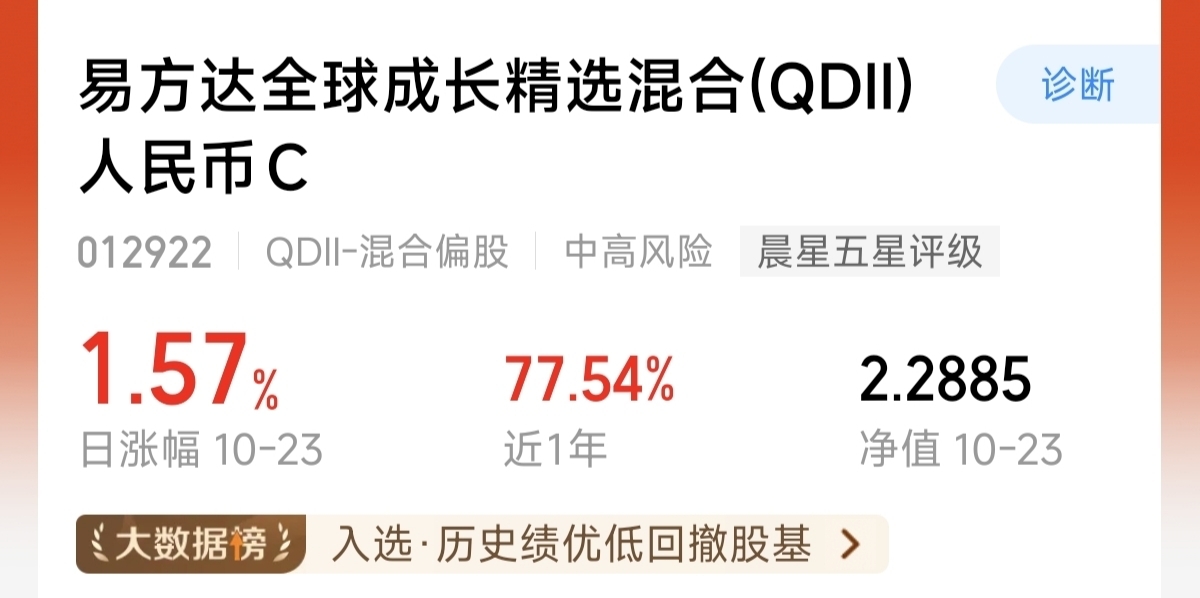 当前来看,全球科技表现还是比较强。易方达全球成长精选混合这只聚焦全球科技的主动混合基金。基金经理通过投资a股,港股,美股多进来把握全球科技机会。长期表现做到了涨多跌少。周五上涨了1.57%。近一年涨幅达到了77.54%。同类长期做到了优秀。而且遇到波动,稳定性好。我看好未来的突破表现。